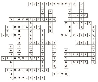 que impacta los pensamientos, las emociones y el comportamiento. / 3. Evaluación negativa de uno mismo, con tendencia a criticarse, autosabotearse, culparse: ...autoestima. / 4. Actividad mental basada en la experiencia, la reflexión y la razón. / 8. Trata de distinguir entre el bien y el mal. / 9. Experiencia sensorial que se percibe como real, pero no lo es. / 12. Sentimiento de infelicidad. / 13. Necesidad biológica nocturna y reparadora. / 14. Sensación de temor e inquietud: estado.../ 15. Estado transitorio de tristeza, incapacidad y dificultad para decidir. / 17. Condición mental eventual, determinada por las emociones y la actitud./ 21. Respuesta emocional ante situaciones que causan miedo, son un desafío o amenaza. / 22. Fuerza física y mental del cuerpo humano. / 23. Terapia de conversación o... / 25. Estado de ánimo extremo, contrapuesto a la depresión. / 26. Aparece por no encontrar alternativas ni soluciones.