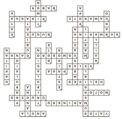2. Embarcación que solamente se desplaza bajo el agua. / 4. Embarcación pequeña con motor. / 6. Personas que trabajan en el barco. / 7. Fuerza que empuja el navío hacia adelante. / 10. Lado derecho de la embarcación, opuesto al babor. / 12. Navega propulsado por motor, remo o vela. / 13. Responsable de la dirección y tripulación de un barco. / 16. Estructura más importante del barco, se extiende desde la proa hasta la popa. / 17. Embarcación pequeña, se usa en actividades de rescate. / 18. Palo vertical, sostiene la vela del barco. / 20. Espacio horizontal del barco, por donde se camina. / 22. Embarcación grande para viajes largos en alta mar. / 24. Embarcación pequeña para una o dos personas, se mueve con palas de doble hoja. / 25. Parte posterior del barco. / 26. Pieza que controla la dirección y el curso que tomará el barco.