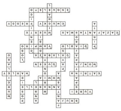 2. Disfraz que incluye sombrero puntiagudo, vestido negro y escoba. / 6. Fantasma clásico del terror japonés, usa kimono blanco y su cabello es largo. / 9. Muñeca con vestido vintage y trenzas, obviamente está poseída. / 10. Envuelta en vendas desgastadas, la... representa las antiguas maldiciones egipcias. / 11. Inspirada en el arte de José Guadalupe Posada, representa la elegancia de la muerte en la cultura mexicana. / 12. Villana de cómic reconocida por su estilo excéntrico. Su atuendo combina colores vivos: ...Quinn. / 14. Disfraz que combina vestidura religiosa y maquillaje espectral. / 15. Inspirada en el misticismo afrocaribeño, su rostro es de calaveras, usa collares y bastón: Voodoo... / 17. Disfraz anaranjado con rostro tallado o pintado. / 21. Disfraz con capa roja, cuernos y tridente. / 22. Disfraz que mezcla elegancia y oscuridad, lleva capa, colmillos y maquillaje pálido. / 23. Usan ropa beige y mochilas de protones. / 24. Es la representación más temida y respetada del fin de la vida: la... / 25. Muñeco asesino que usa overol azul, camiseta rayada y una peluca pelirroja. / 26. Con su guante de cuchillas y su suéter rojo con verde, este personaje representa el terror en los sueños. / 27. Sencillo pero icónico, traje negro con huesos blancos.