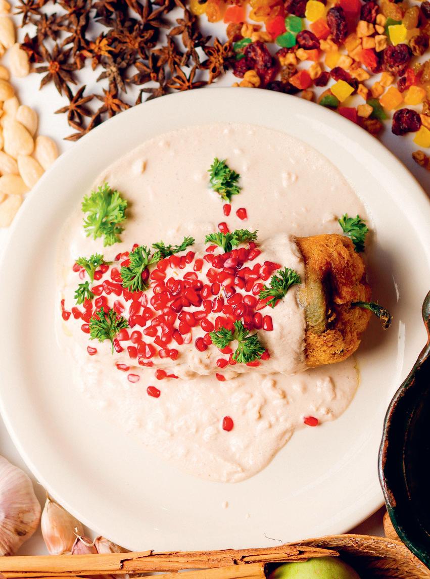 El chile propuesto por el chef Alejandro Cuatepotzo se elabora con ingredientes de Calpan, Puebla. El relleno consta de carne de res y cerdo, manzana panochera, durazno criollo, pera lechera, fruta cristalizada, almendras y piñones en una mezcla que, al pasar por el horno de brasas, resalta cada sabor. La nogada se hace con nuez de Castilla, queso de cabra y jerez. Para quienes no comen carne, hay una versión vegetariana del chile, con relleno de trigo y quinoa. El capeado, aunque se recomienda, es opcional. Este platillo también viene como parte de Desde la Raíz, menú de tres tiempos que incluye consomé de hongos de lluvia o ensalada con queso de cabra y fruta asada, y de postre affogato con helado artesanal de higo.