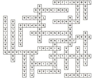 en la parte posterior del brazo. / 5. Conjunto de repeticiones del ejercicio, separadas por un descanso. / 9. Ejercicio suave, consiste en alargar los músculos. / 11. De pie, las rodillas se flexionan y baja el cuerpo, conservando la verticalidad del tronco. / 12. El cuerpo en línea recta al piso, cada rodilla irá hacia el pecho y regresará a su posición inicial. / 14. Una pierna soporta el peso con la rodilla flexionada, la otra estira en paralelo al suelo: … squat / 17. Forma de entrenamiento, saltando sobre una superficie elástica y haciendo ejercicios. / 19. Ejercicio de fuerza, levantando la barra del suelo a la cintura: …muerto. / 20. Acostado boca arriba o sentado, se flexionan las rodillas para después estirar las piernas. / 21. Ejercicio de alta intensidad, combina una flexión de pecho, una sentadilla y salto vertical. / 22. Inmóvil y en paralelo al suelo, los antebrazos y la punta de los pies apoyan y resisten. / 24. Correr a ritmo lento. / 25. Colgarse de una barra fija y levantar el cuerpo varias veces sobrepasando la barra. / 26. El cuerpo forma una línea recta, bajando y subiendo brazos y tronco antes de tocar el suelo.
