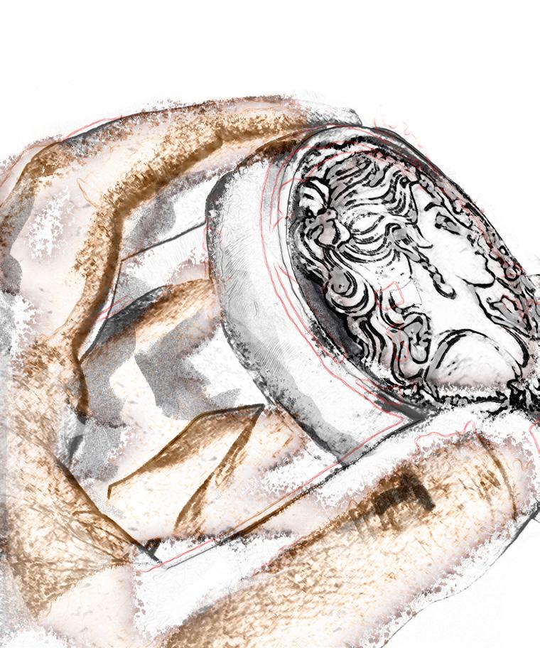 Le tele offerte dalla natura su cui quest’ultimo si troverà a lavorare sono essenzialmente due: la delicata Conchiglia Corniola, caratterizzata dal suo fondo rosso-arancio e la superficie color crema; e la più decisa Conchiglia Sardonica, la cui peculiarità risiede nel contrasto quasi caravaggesco tra lo strato interno marrone scuro e la candida tonalità color crema, a tratti bianca, della superficie.