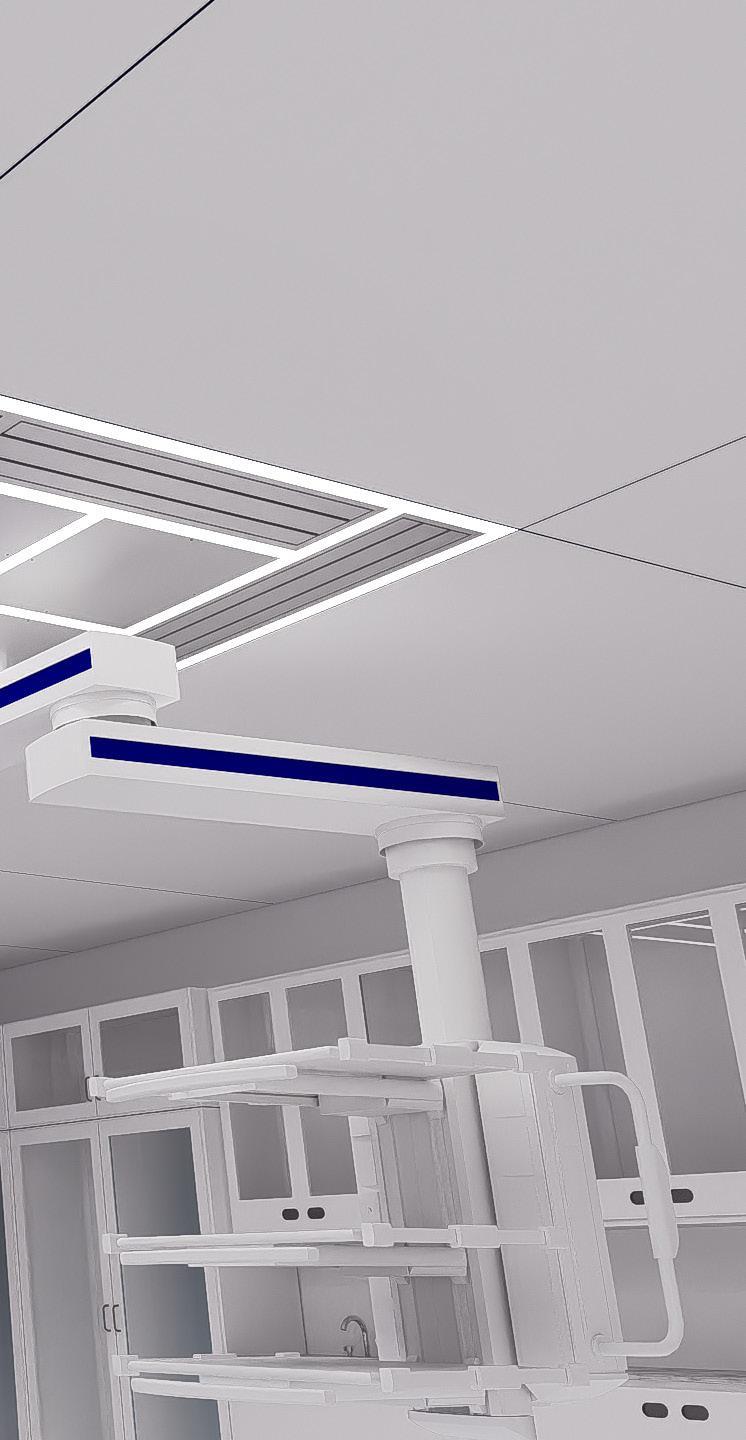 To reduce onsite complexity, modular units are assembled and fitted out in the plant, then carefully packaged for delivery so they arrive completely intact and ready to install. Installation is designed to be efficient and straightforward: the primary modular infrastructure can be set in place within a single day, with the full ceiling system completed in just a few days. With a compact 24”– 36” height, the system is ideal for low floor-tofloor conditions, helping maintain clear operating room ceiling heights of 9 to 10 feet.