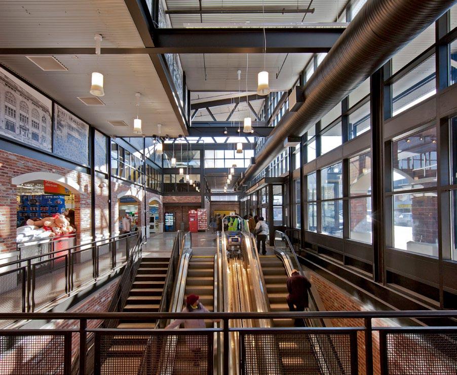 was built on the site in 1909. In fact, the skylight atrium that runs the entire length of the store is supported by harvested trusses that were taken directly from the historic car barn. Reclaimed brick (taken from the actual car barn itself, in addition to brick created to resemble the historic brick) plays an important role in the construction of the interior of the store as well as in the patterns across the interior and exterior walking surfaces along the front of the store.