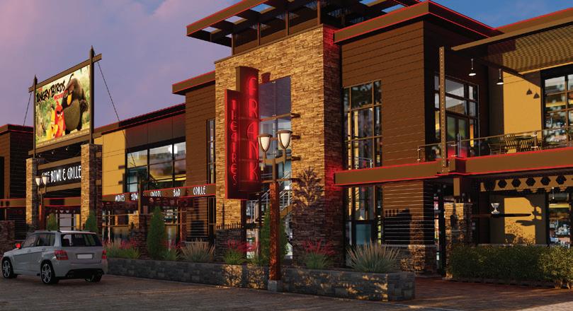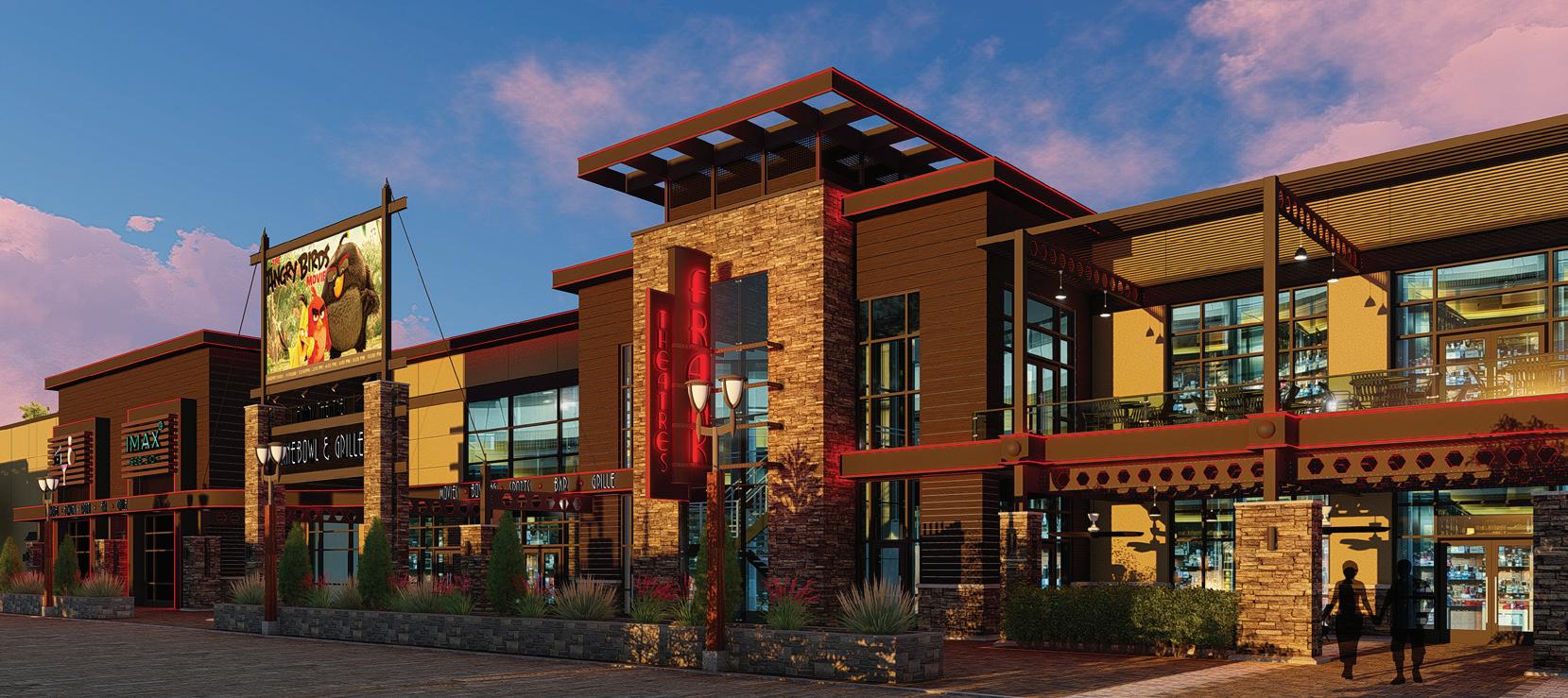 The entertainment hub for the project boasts a 60,000 square foot Frank Theatres with stadium seating IMAX theatres, bowling alleys, a sports bar and a Flair Street Grill with outdoor seating that overlooks the courtyard.
