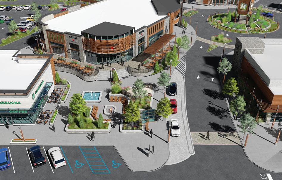 Between the Red Star Craft House and the Starbucks Coffee is a beatiful waiting area for shoppers gather, relax and unwind. The waiting area features wooden adirondack chairs, stone walls, landscaping, a fire pit and a water feature. There is also a valet parking dropoff for customers.