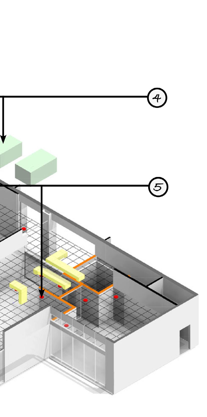 3. The above-door transfer grille simply has two grilles located above the door between the room and common space, one on each wall, with offset baffles to limit sound transmission.