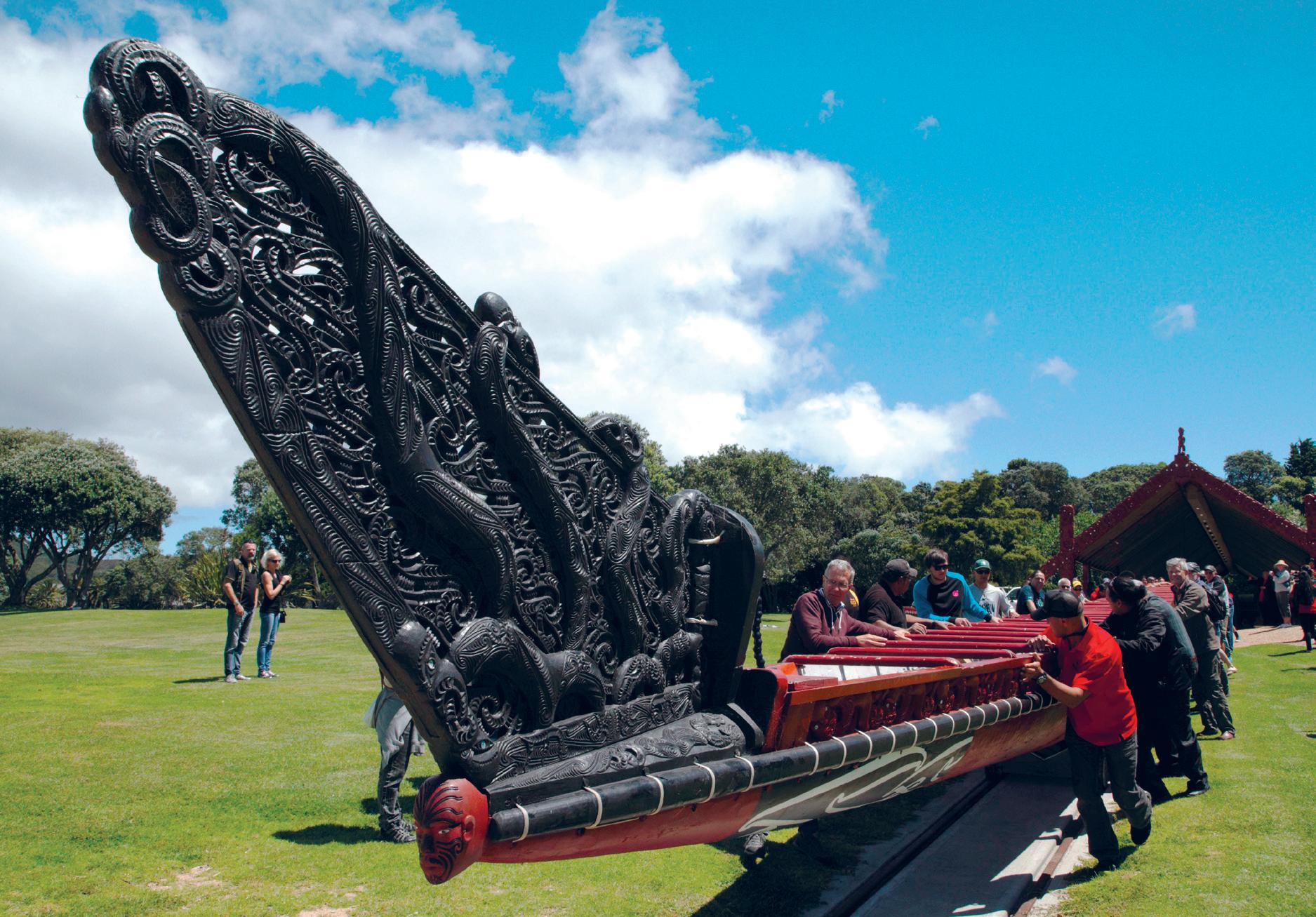 helped by willing tourists, Ngātokimatawhaorua is pushed from its shelter, te Korowai ō Maikuku, along railway tracks toward the shore. it’s a far cry from the early days, when the waka was rolled across logs in the traditional manner and then pulled back up to the canoe house with the help of a winch. Jeff evans