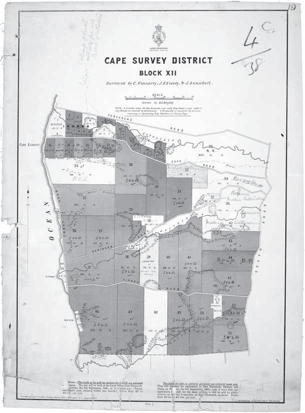 But the Irishman persevered, seeking some years later ‘[a] milker, Man preferred’.28 In 1902 he signed a lease on a second farm, Section 2 Block 13 of the Cape Survey District, which was on the Opourapa Road, not far from the first. A third — Section 102 Block 12 of the Cape Survey District — followed in 1922, although this farm belonged to his wife, who paid Hori Teira £2947 for a property which, in the archives that tell the story of the alienation of land from Taranaki Māori, is called Parihaka A.