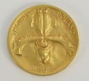 The Roland Gold Medal, designed by Blanche Ames in 1927, is awarded for exceptional skill in the science and practice of hybridization and propagation of ornamental plants. The first medal was given to its eponym, Thomas Roland (1863-1929,) who was particularly fond of cypripediums. The obverse of the medal bears a representation of a cypripedium orchid with the words "Thomas Roland Medal" along the rim.