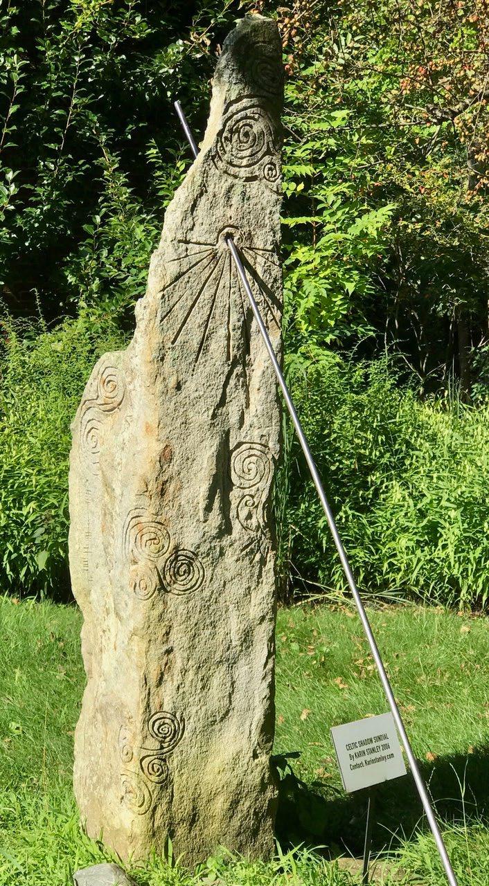 One of my largest and most significant sculptures to date, “The Celtic Shadow Sundial,” (pictured left) was featured at the Garden in the Woods show “Rock On” and then moved to MHS. It now resides in the front of the redbrick educational building. If you look at the radial clock on the stone, the gnomon shows the time from dawn to dusk (albeit Daylight Savings Time). It is especially gratifying to visit on the summer and winter solstices, where one may observe the difference in shadows between the shortest and longest days of the year.