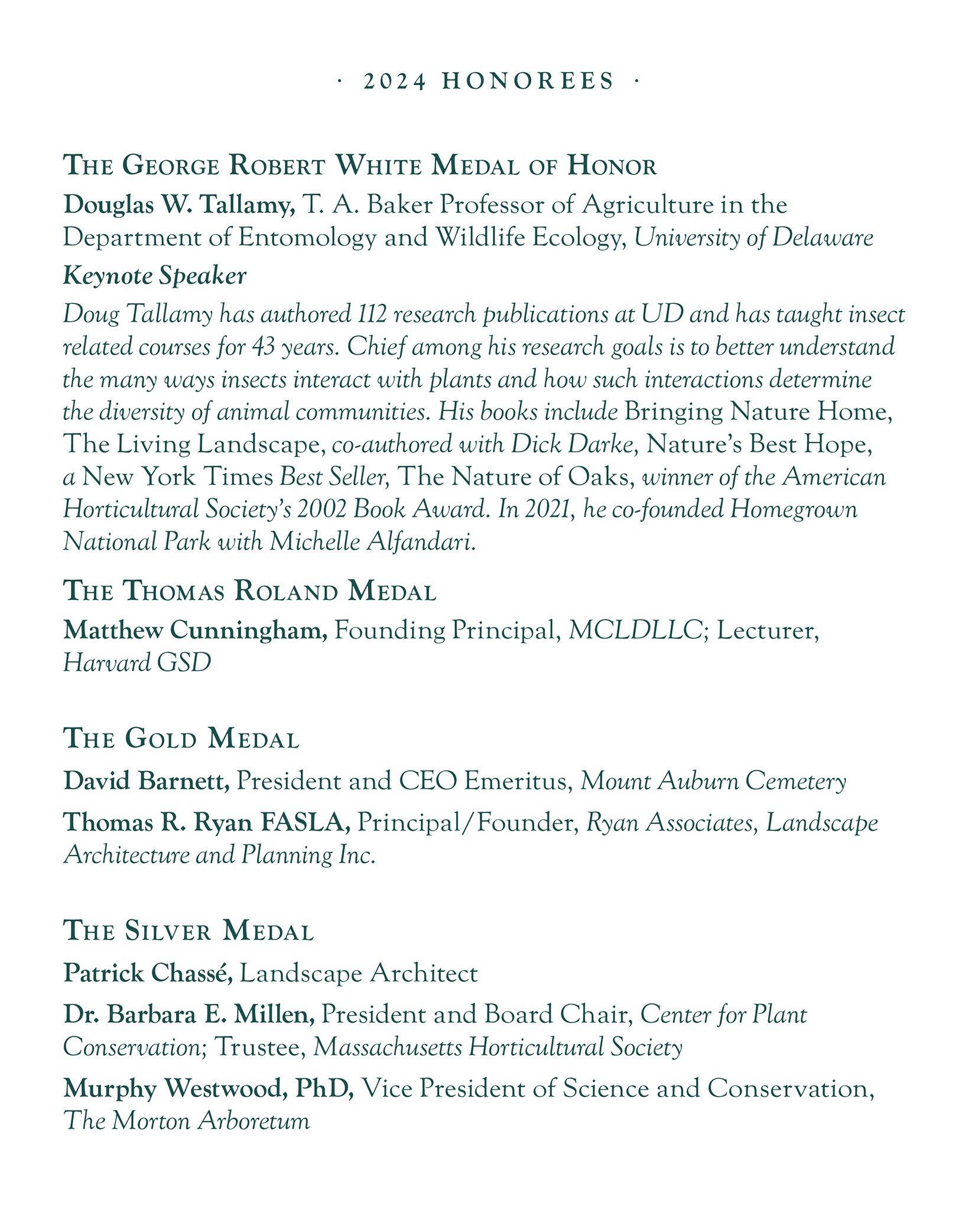 The dinner will be preceded by an optional day-long symposium, featuring lectures by medal winners Doug Tallamy, Tom Ryan, Matt Cunningham, and Murphy Westwood. You can purchase your tickets for the awards ceremony dinner and/or the symposium by clicking the button below. Boston Society of Landscape Architects and MHS members receive symposium ticket discounts. Proceeds benefit Massachusetts Horticultural Society’s mission to promote the art and science of horticulture for the public good.