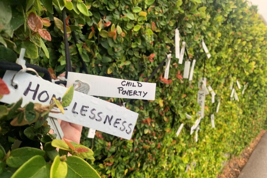 Among those were smaller signs with the words “homelessness, child poverty, human trafficking, family violence, religious discrimination”, and more written on them.
