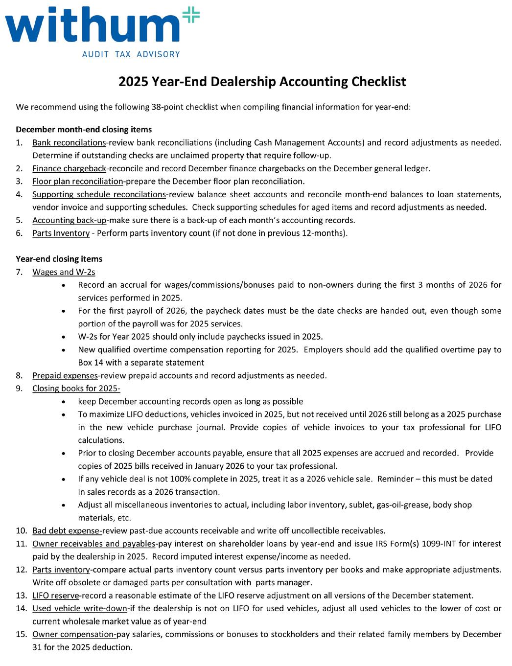 Soon, we will be closing the books on 2025. As we approach the end of the year, we can look back on matters that were resolved hopefully to the benefit of our dealerships – delays of EV mandates here and the ultimate repeal of the CARB mandates in Congress; passage of electronic titles for our RMV to implement; revised federal tax policies; new junk fee regulations with a dealership carve-out, just to name a few.