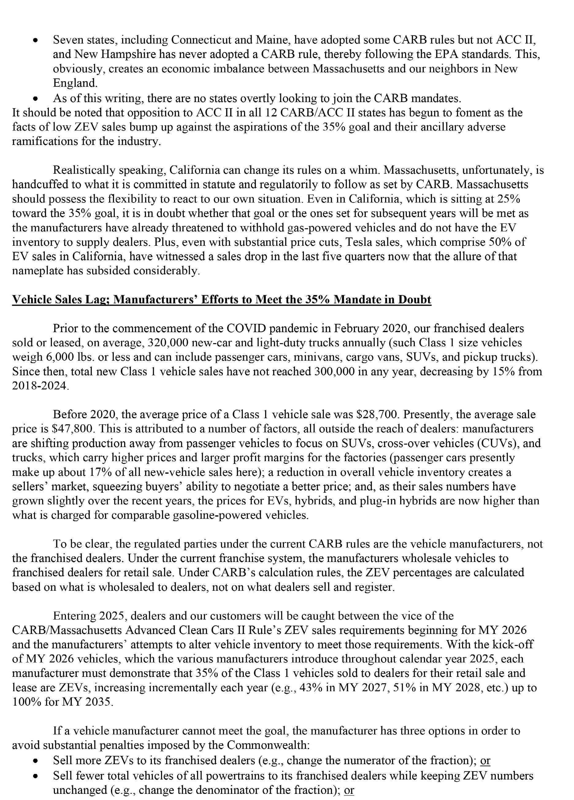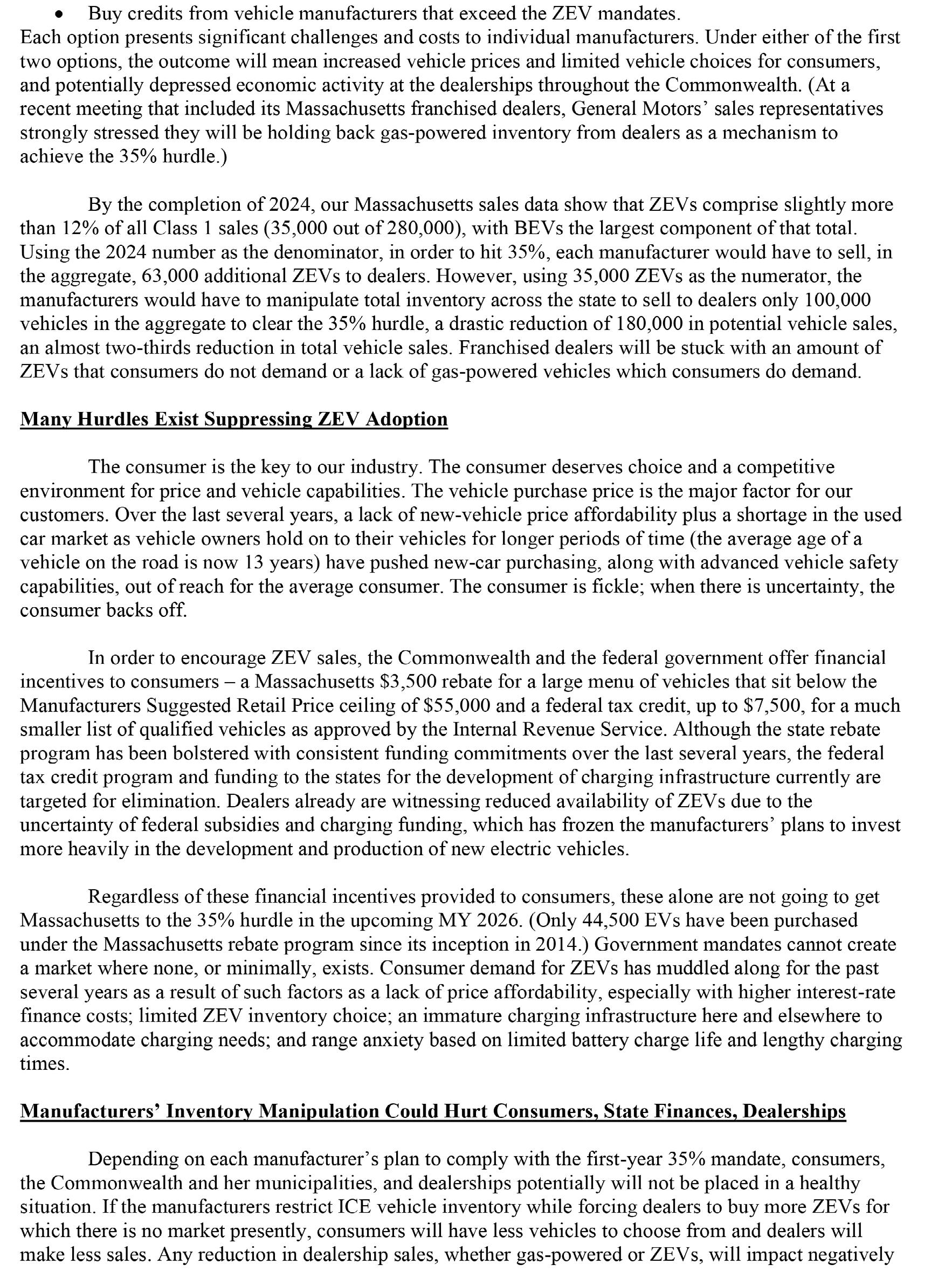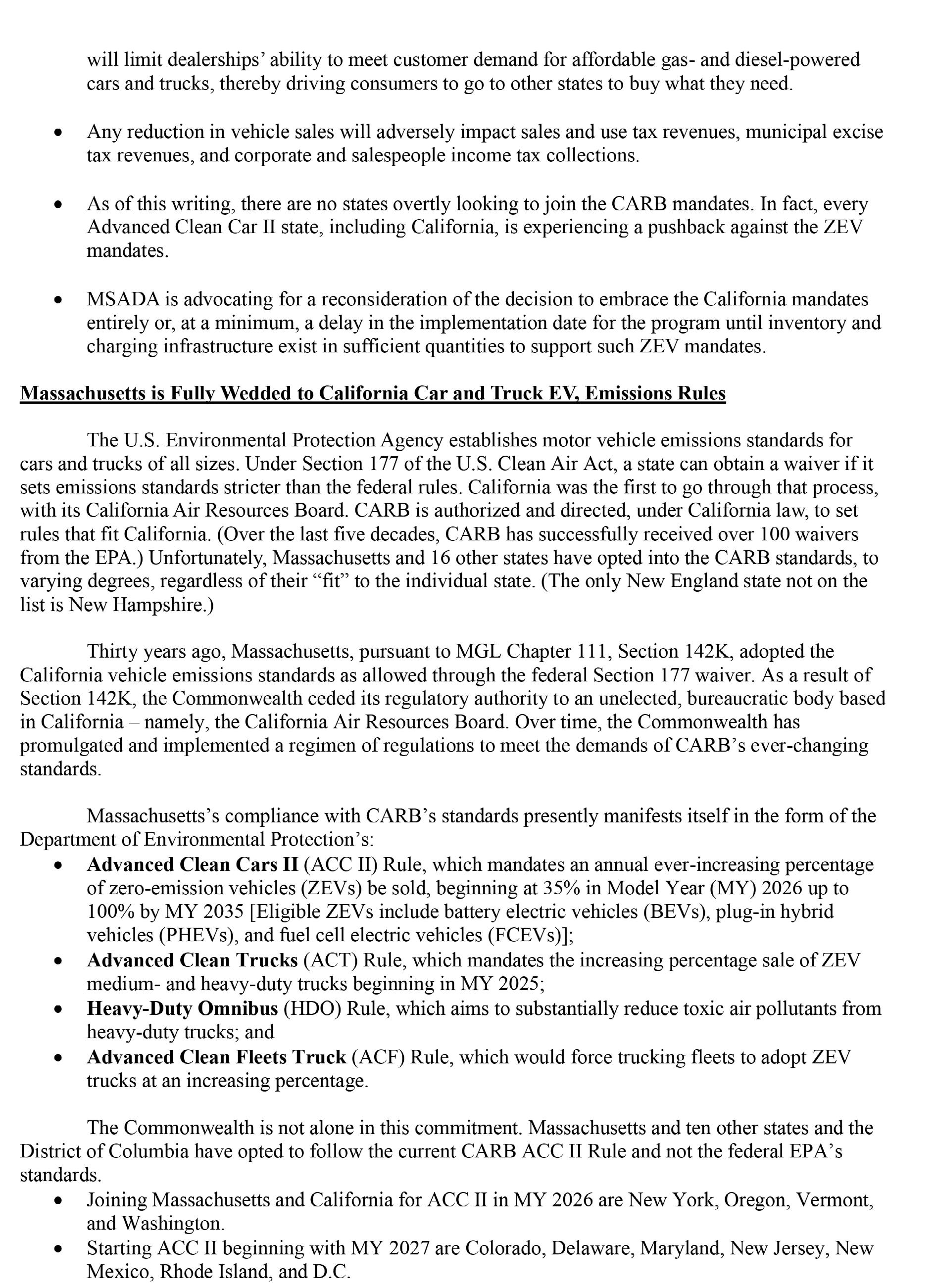 As we have covered in our prior communications, our franchisor manufacturers, under California’s Advanced Clean Cars II (ACC II) rule, need to hit 100% in ZEV sales by MY 2035, beginning with the first hurdle of 35% in MY 2026 and increasing by 8% in every subsequent year. The math shows the only way our manufacturers will hit those numbers is by selling us more ZEVs while reducing the amount of ICE vehicles on our lots, thereby hurting our Massachusetts customers’ ability to find the cars they want and can afford. The Advanced Clean Truck (ACT) rule, covering ZEV requirements for medium- and heavy-duty trucks, already has kicked in for MY 2025, with disastrous results for dealers and fleet owners alike and ultimately the taxpayers.