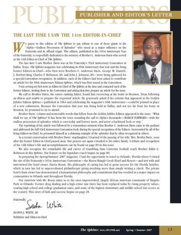 e pause in this edition of The Sphinx to pay tribute to one of those giants in the “Alpha—Endless Procession of Splendor” who stood as a major influence on the Fraternity and its official organ. This edition, published in the 101st Anniversary Year of the Fraternity, is respectfully dedicated to the memory of Brother C. Anderson Davis who served as the 14th Editor-in-Chief of The Sphinx. The last time I saw Brother Davis was at the Fraternity’s 93rd Anniversary Convention in Dallas, Texas. The Sphinx magazine was celebrating its 85th Anniversary that year and the living former Editors-in-Chief—who then were Brothers C. Anderson Davis, George M. Daniels, J. Herbert King, Charles F. Robinson, III, and John J. Johnson, III—were being gathered for a special Convention recognition. In addition, each of the Editors had been asked to contribute an article for the 85th Anniversary Edition Sphinx, which was first issued at the Convention. I was serving my first term as Editor-in-Chief of The Sphinx at the time and contacted each of the former Editors, inviting them to the Convention and asking that they prepare an article for the issue. My call to Brother Davis, the senior ranking Editor, found him recovering at his home in Houston, Texas following an illness and unable to prepare the requested article. He graciously asked if his column that appeared in the Golden Jubilee Edition Sphinx—published in 1964 and celebrating the magazine’s 50th Anniversary—could be printed in place of a new submission. Because the Convention that year was being held in Dallas, and not too far from his home in Houston, he promised to try to attend. Brother Davis’ column and memorable words that follow from the Golden Jubilee Edition appeared in the issue: “What shall we say of The Sphinx? It has been the voice sounding the call to Alpha’s thousands—MARCH FORWARD—with the endless procession of splendor, which is ours today and forever more, and never a backward look or step.” The reprinting of his article was followed by a tremendous moment when Brother C. Anderson Davis came to the podium and addressed the full 93rd Anniversary Convention body during the special recognition of the Editors. Surrounded by all of the living Editors-in-Chief, he presented himself as a shinning example of the splendor that he often recognized in others. In a recent conversation with Brother Davis’ stepdaughter, I learned of the passing of his wife, Mrs. Bertha Davis, soon after the former Editor-in-Chief passed away. Our prayers are again extended to his entire family. A tribute and recognition of the 14th Editor’s life and accomplishments can be found on page 89 in this issue. We also recognize the remarkable life and career of Grambling State University football coach Brother Eddie G. Robinson in this Sphinx. Our feature on the legendary coach begins on page 80. In preparing the Spring/Summer 2007 magazine, I had the opportunity to travel to Orlando, Florida where I visited the site of the Fraternity’s 101st Anniversary Convention—the Rosen Shingle Creek Hotel and Resort—and met with and interviewed the hotel owner, Harris Rosen. His philosophy of caring has led to great success for the Florida hotelier, which in turn has led to unprecedented philanthropic giving involving more than simply writing a check. The private hotel-chain owner has demonstrated a humanitarian philosophy and commitment that has resulted in a major impact on communities in Orlando and throughout Florida. Our interview with Mr. Rosen takes us to the once-impoverished, largely African American community of Tangelo Park in Orlando. Former drug dealing and a high crime rate there has been replaced today by rising property values, soaring high school and college graduation rates, and some of the highest elementary and middle school test scores in the country. This story of faith and success begins on page 28. Fraternally,