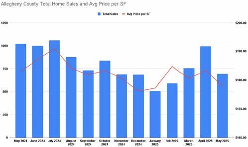Prices for existing homes have increased at a lower rate. Residential real estate services report that the average sales price was higher by 2.5 to 4.8 percent in May 2025 compared with a year earlier. Firms report that more homes were for sale in May versus April or a year earlier; however, sales data for Allegheny County shows that sales declined roughly 30 percent year-over-year in May. There were 693 home sales in Allegheny County in May at an average cost-per-square-foot that was $177.91, or $5 lower than a year ago.