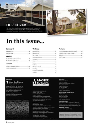 Master Builder is the official publication of The Master Builders Association of Western Australia. It is produced five times per year and published by Crowther-Blayne & Associates Pty Ltd. Master Builders Association of Western Australia was established in1898 and is the state’s oldest building industry organisation. The MBAWA is part of the Australia-wide Master Builder movement. Master Builder is produced to keep members informed of matters affecting them. Opinions and/ or statements in any editorial and/or advertisements are not necessarily those of the publisher and/or the MBAWA. The publisher reserves the right to reject any material deemed unsuitable for publication. Other than for the purposes of and subject to the conditions prescribed under the copyright Act 1968, no part of Master Builder may in any form or by any means (electronic, mechanical, microcopying, photocopying, recording or otherwise) be reproduced, stored in a retrieval system or transmitted without prior written permission from the MBAWA or Crowther-Blayne & Associates Pty Ltd.