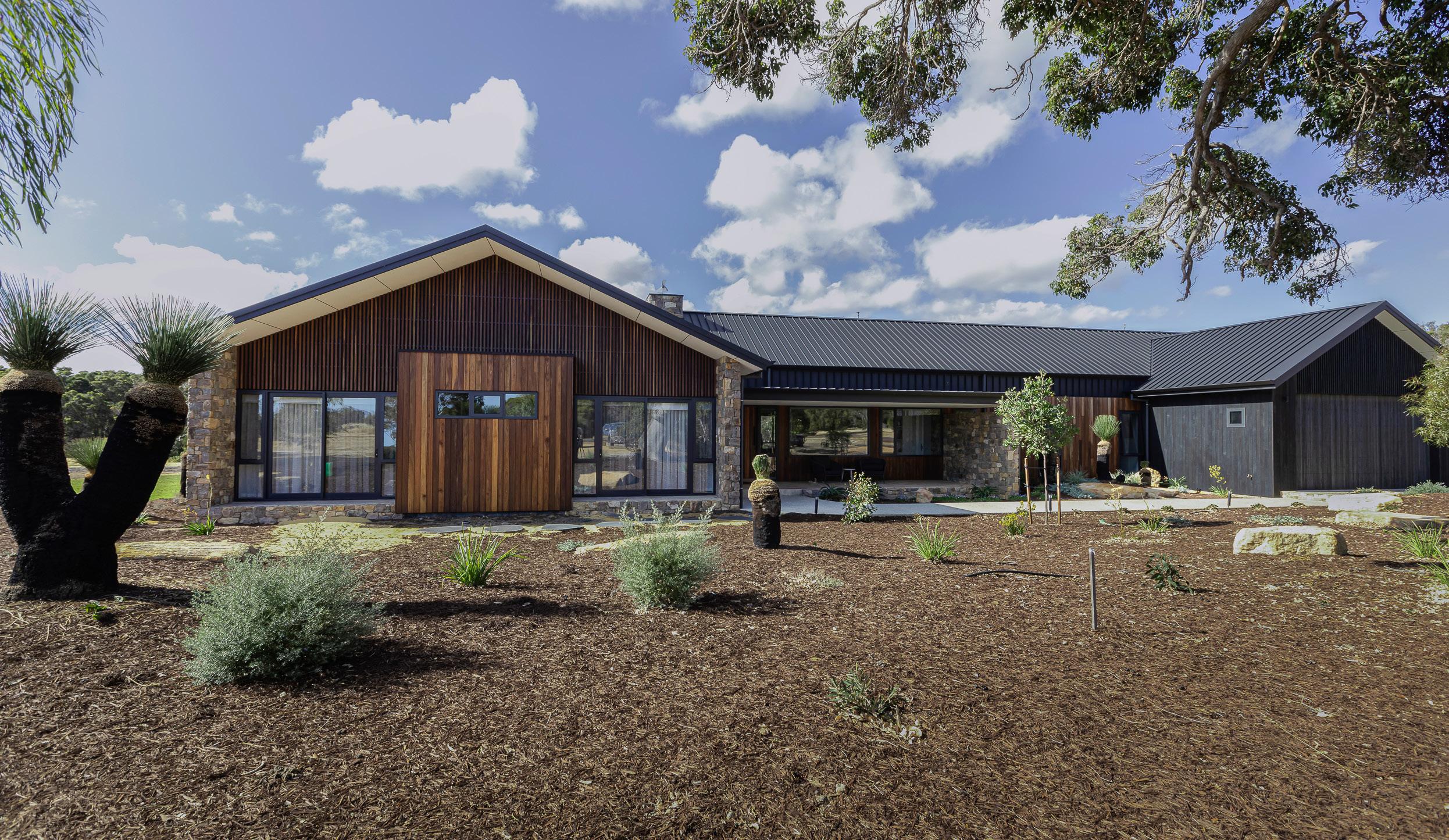 Modern farmhouse with dam views to the north and ocean views to the south west. External cladding consists of select jarrah, custom shou sagi ban charred timber, builders prominence metal sheeting and granite stonework.