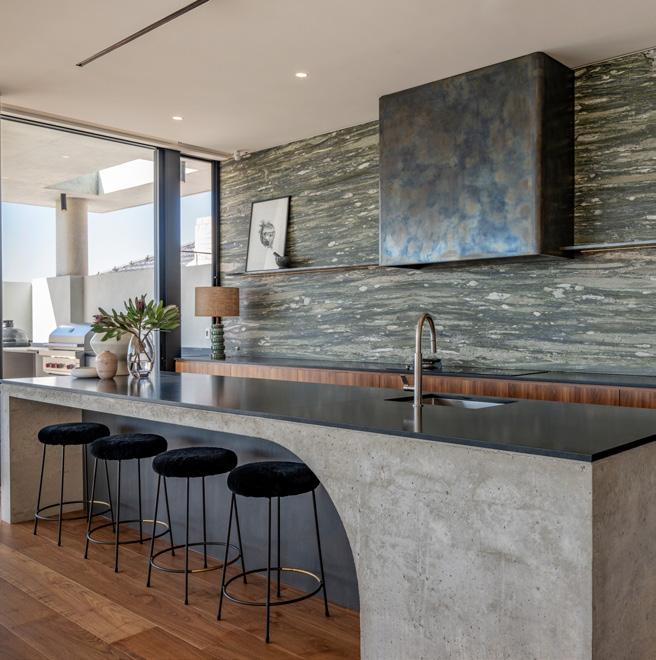 A spacious, elevated, and cleverly designed modern family home that fully utilises the whole property has taken the place of the modest cottage that was originally placed on the sloping corner lot. The large, open-concept living area, together with a beautiful, modern, light-filled kitchen, all lead out to the open entertainers’ decking area to further soak in the ocean views. A creative blend of maintenancefree exterior finishes of tumbled brickwork and cladding complements the feel of the surroundings. Ample-sized bedrooms, some with water views, and well-appointed bathrooms complete this beautiful and practical family