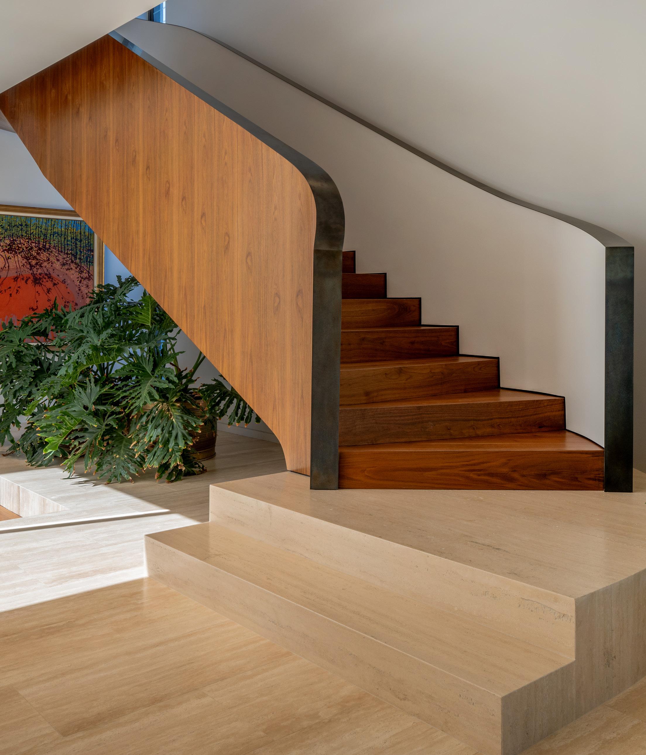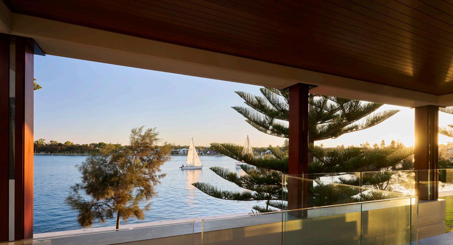 The internal water feature serves as an alluring introduction to the canal views beyond, while the uninterrupted flow from the interior to exterior is achieved through the seamless continuation of the joinery, roof planes, planters, materiality, and living spaces, through the transparent glazing lines. Feature columns provide flexibility in maximising these glazed areas and optimise the full potential of the view, while the courtyard provides an abundance of natural north light and cross-ventilation to the main living areas.
