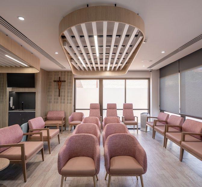 The precinct includes 182 aged care rooms with common areas, integrated with hospital, residential, retail, and commercial facilities. The building’s façade combines punched windows, double-height glazing, window walls, awnings, aluminium louvers, and perforated screens, creating a modern and welcoming aesthetic.