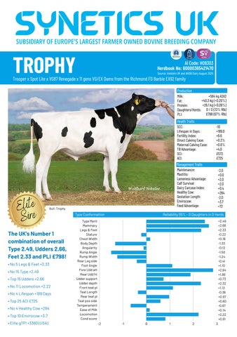 Type Conformation Reliability 91% 122 UK Daughters in 48 UK Herds Type Merit Poor Excellent +1.92 Mammary Poor Excellent +2.13 Legs & Feet Poor Excellent +2.44 Stature 136cm 160cm +1.98 Chest Width Narrow Wide -0.29 Body Depth Shallow Deep +0.66 Angularity Coarse Open Rib +1.68 Rump Angle High Pins Low Pins +0.82 Rump Width Narrow Wide +1.62 Rear leg side Straight Sickled -0.08 Foot angle Low Steep +0.49 Fore udd att Loose Tight +2.49 Rear udd ht Very Low Very High +2.01 Udder supp Broken Strong +1.49 Udder depth Below Hock 20cm above +2.31 Front teat pl Outside Close +0.03 Teat length Short Long +2.13 Rear teat pl Apart Close +0.04 Teat pos side Close Apart -0.08 Temperament Poor Good -0.17 Ease of milk Slow Fast -0.38 Locomotion Poor Excellent +3.36 Cond Score Low High -0.36 -3 -2 -1 0 +1 +2 +3 Production Milk: +229 kg A2A2 Fat: -6.1 kg (-0.18%) Protein: +4.9 kg (-0.03%) UK Daughters/Herds: 212 / 78 (97% Rlb) PLI: £107 (90% Rlb) Health Traits SCC: -23 Lifespan in Days: +73.0 Fertility Index: -1.0 Direct Calving Ease: -1.6% Maternal Calving Ease: +0.1% TB Advantage: +7.1 SCI: £-24 ACI: £71 Management Maintenance: +14.0 Mastitis: -3.0 Lameness Advantage: +1.0 Calf Survival: -0.6 Dairy Carcase Index: -0.4 Healthy Cow: +142 Gestation Length: +0.0 Envirocow: +0.1 Feed Advantage: -72