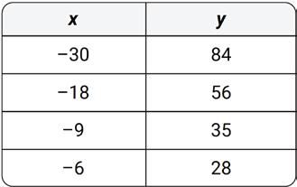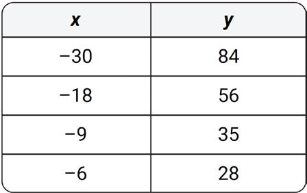 1. The correct answer is A. The rate of change of y with respect to x is the same as the slope of the points in the table. Find the slope using two points. Let’s use the points (–9, 35) and (–6, 28).