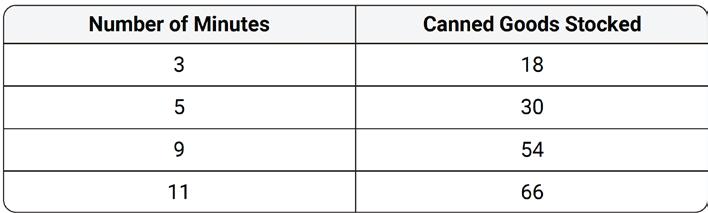2. An employee is stocking canned goods on shelves. The table below shows the linear relationship between the number of canned goods stocked after certain lengths of time.