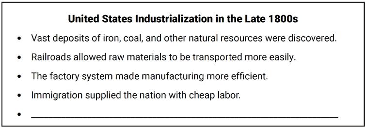 Resources. Railroads. Factory. Immigration. It all connects to money and business.