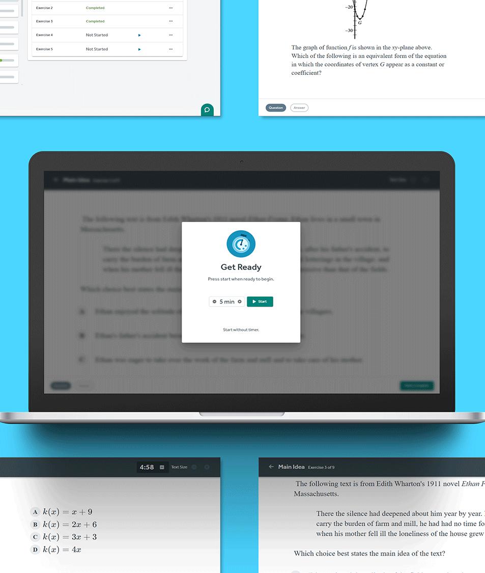 Full-length SAT practice tests mirror the rigor and format of the official exam and produce detailed reports to identify areas for growth across Reading and Writing and Math. The Online Course then delivers engaging, conversational microvideos with prompts and support to help students master non-negotiable skills.