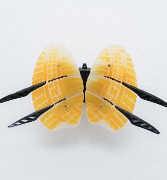 02. Faysal Altunbozar, Carrier No. 5 (3000 miles worth of sweet sweat) 2022, resina, pigmento, arcilla epoxi, semillas de algodoncillo, soporte metálico.
