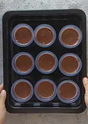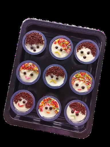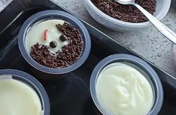 Setelah set, keluarkan dari kulkas. Beri 1 sdm vla di atas nya, kemudian hias dengan meses sebagai rambut . Lalu choco cips sebagai mata.