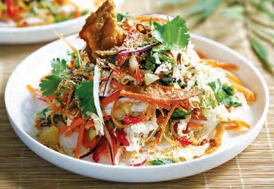 Lavez et épluchez les carottes. Coupez-les en fi ne julienne. Lavez et coupez en fi nes lamelles le demi poivron. Lavez, essorez et émincez le chou chinois en lanières. Lavez les germes de soja. Épluchez et ciselez fi nement la coriandre. Râpez le gingembre. Dans un saladier, mélangez le chou chinois, les carottes, le poivron, les germes de soja et la coriandre ciselée. Mélangez l’huile de sésame avec le jus de citron, le gingembre, salez et poivrez. Versez sur la salade, mélangez et servez. sez sur r la a sala ade d , méla angez et Servez accompagné de poulet frit ou de grosses crevettes. é de poulet fr frit t ou de grosses c