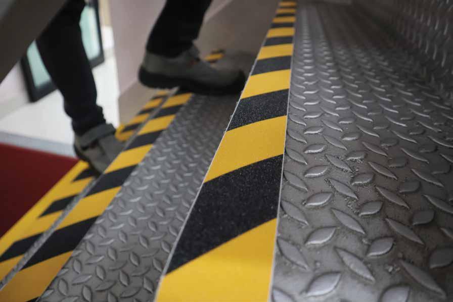 La línea conformable es una solución exclusiva de 3M™. Se trata de un material antideslizante y de alta fricción con un refuerzo especial de papel de aluminio que se ajusta a esquinas y se adhiere a super cies irregulares. Es resistente a la lluvia y al trá co intenso de personas, tanto en interiores como en exteriores.