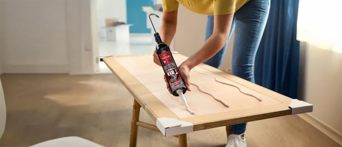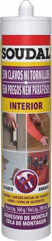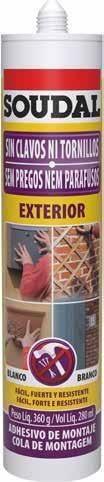 Sin clavos ni tornillos para interior y exterior, es un adhesivo de montaje listo para usar, a base de agua, con una adherencia inicial muy alta (125 kg/m²) y una gran fuerza final. Extremadamente adecuado para superficies porosas.