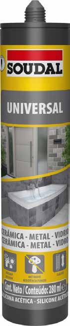 Sellador universal de gran elasticidad con curado acético, resistente a moho y rayos UV. Fácil de aplicar, pero no apto para materiales sintéticos sensibles.