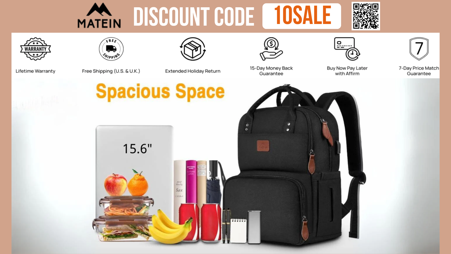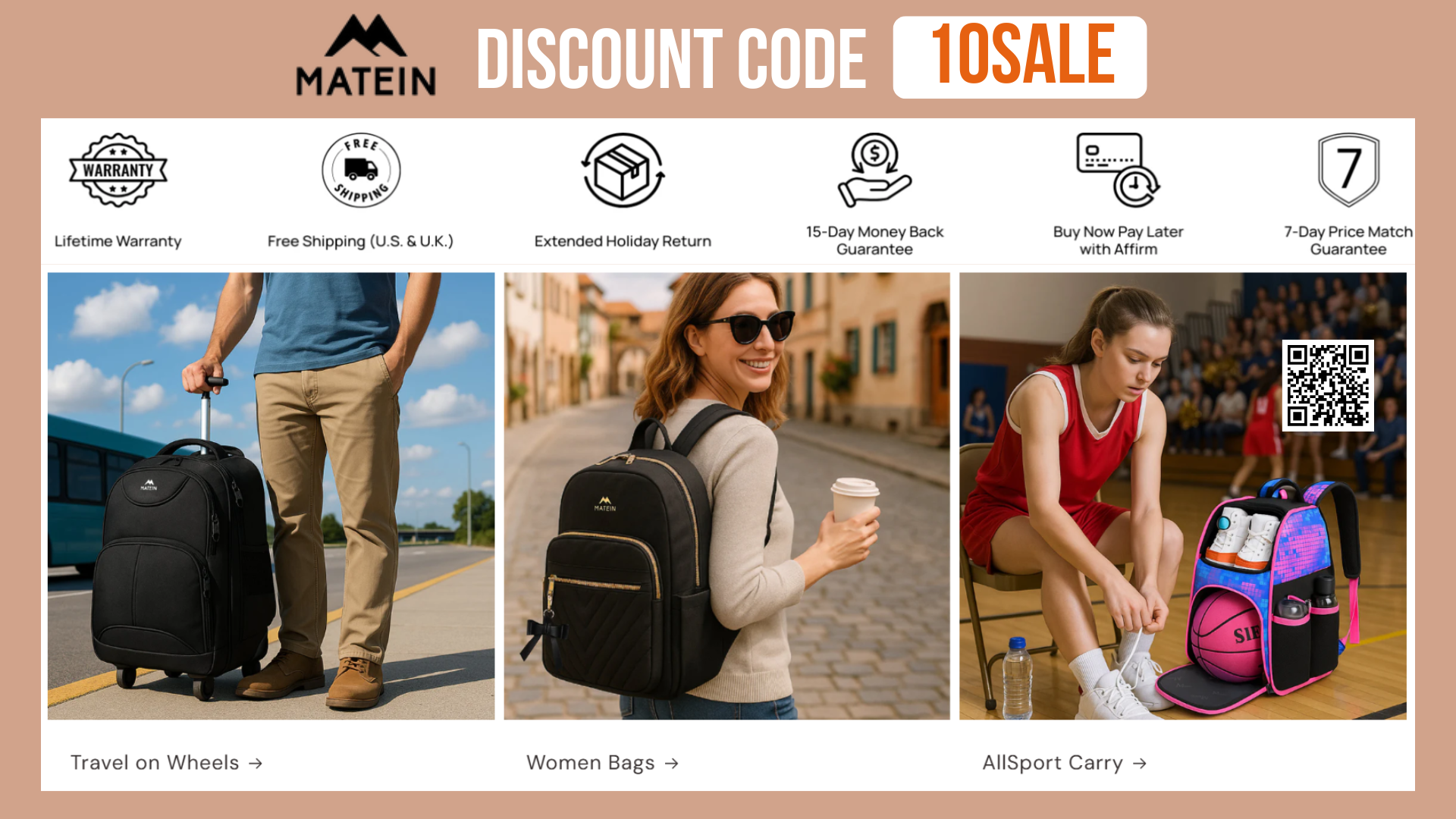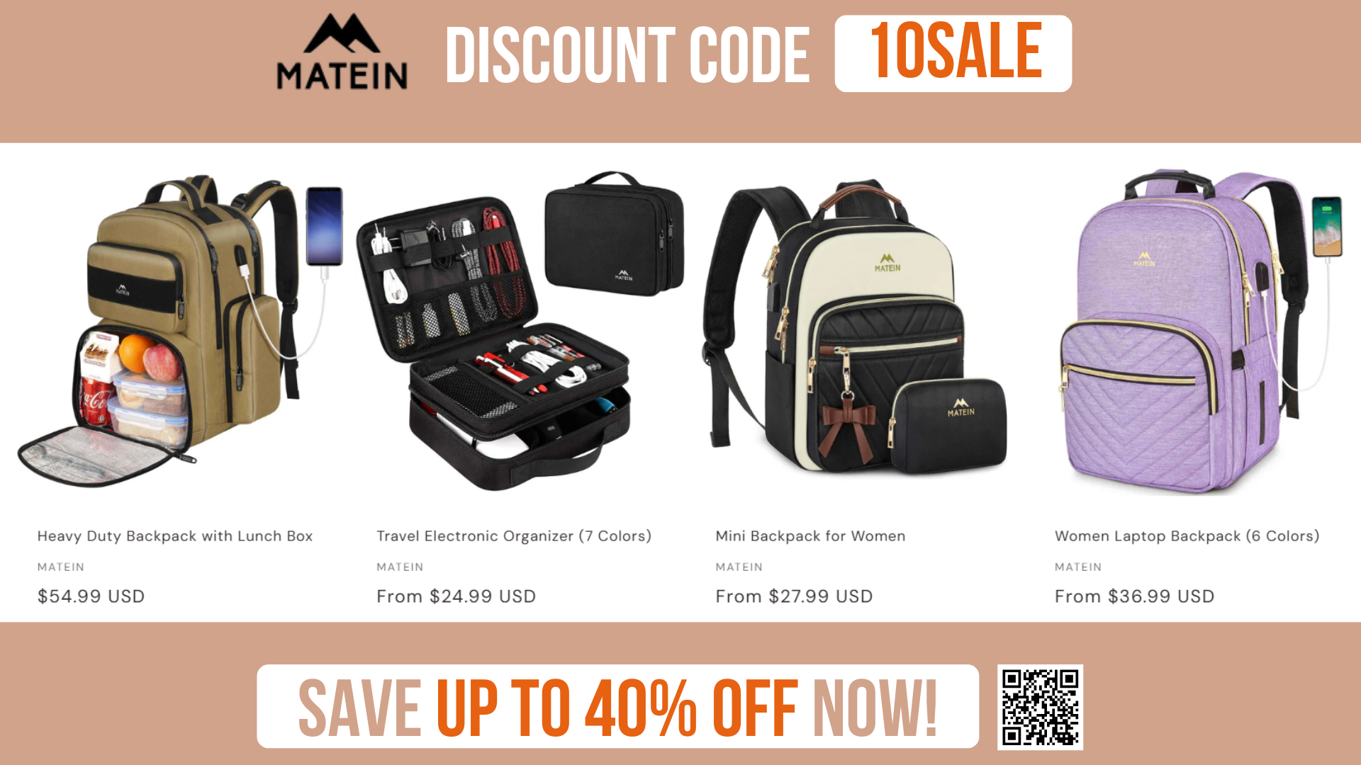 💼 Works for All Products — Whether you’re grabbing a tech organizer, a laptop backpack, or a carry-on duffle, this discount applies to every single item on matein.com.