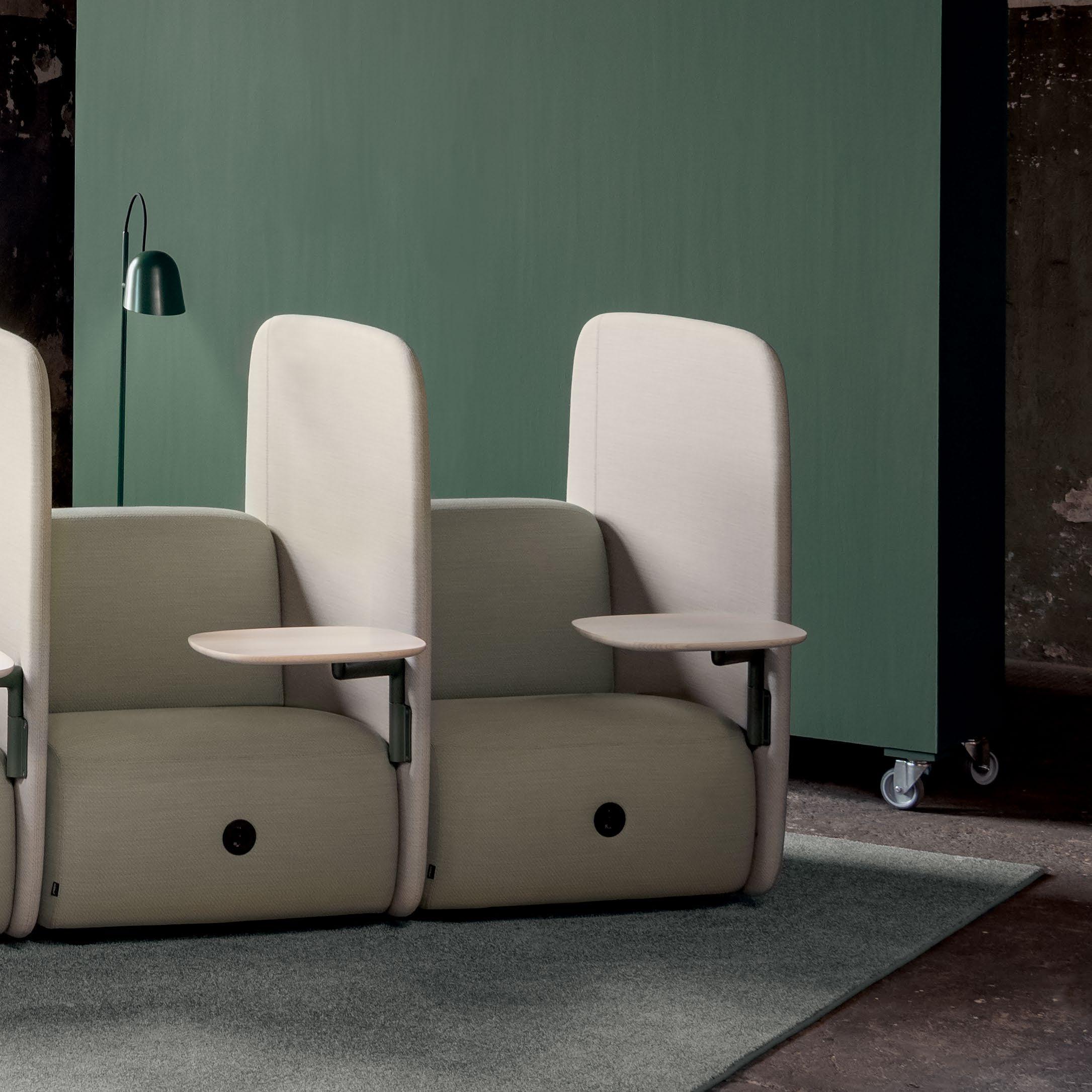 också en klädd skärm som gör det enkelt att dela av modulsoffans sektioner och skapa en avskild yta för avkoppling eller arbete. Även ett smalt armstöd finns som alternativ, vilket ramar in och skapar en exklusiv och elegant loungemöbel. Skrivskivans arm samt kärlet finns pulverlackade i vårt färgkoncept Colours by Materia (CbM*). Träet som är FSC®-märkt kommer i massiv vitpigmenterad eller svartbetsad ask.