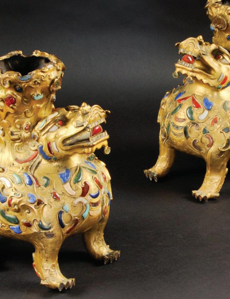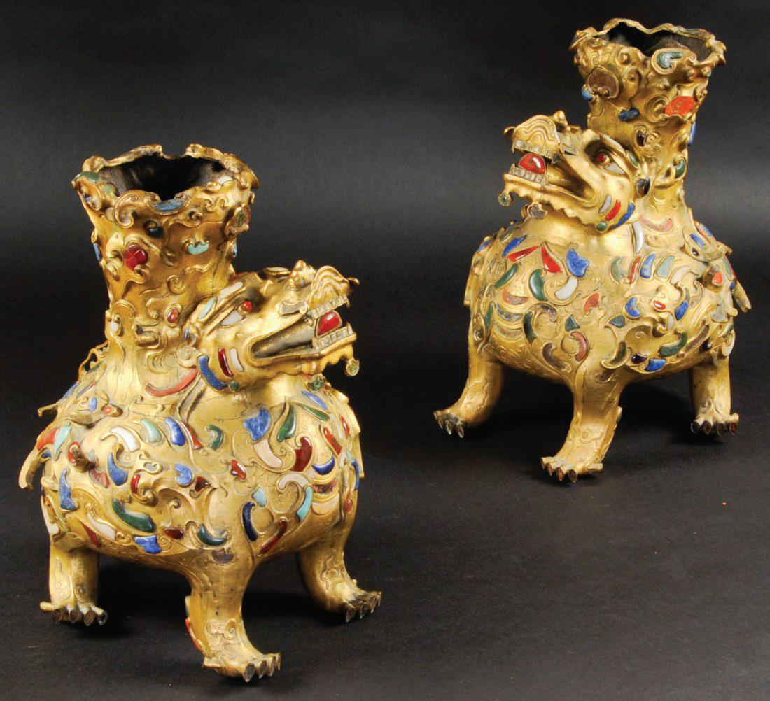 Pair of Chinese Jeweled Gilt Bronze Foo Dogs Sold for $143,750
