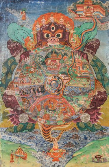 Fine Antique Tibetan Thangka with Disembodied Heads. Sold for $8320