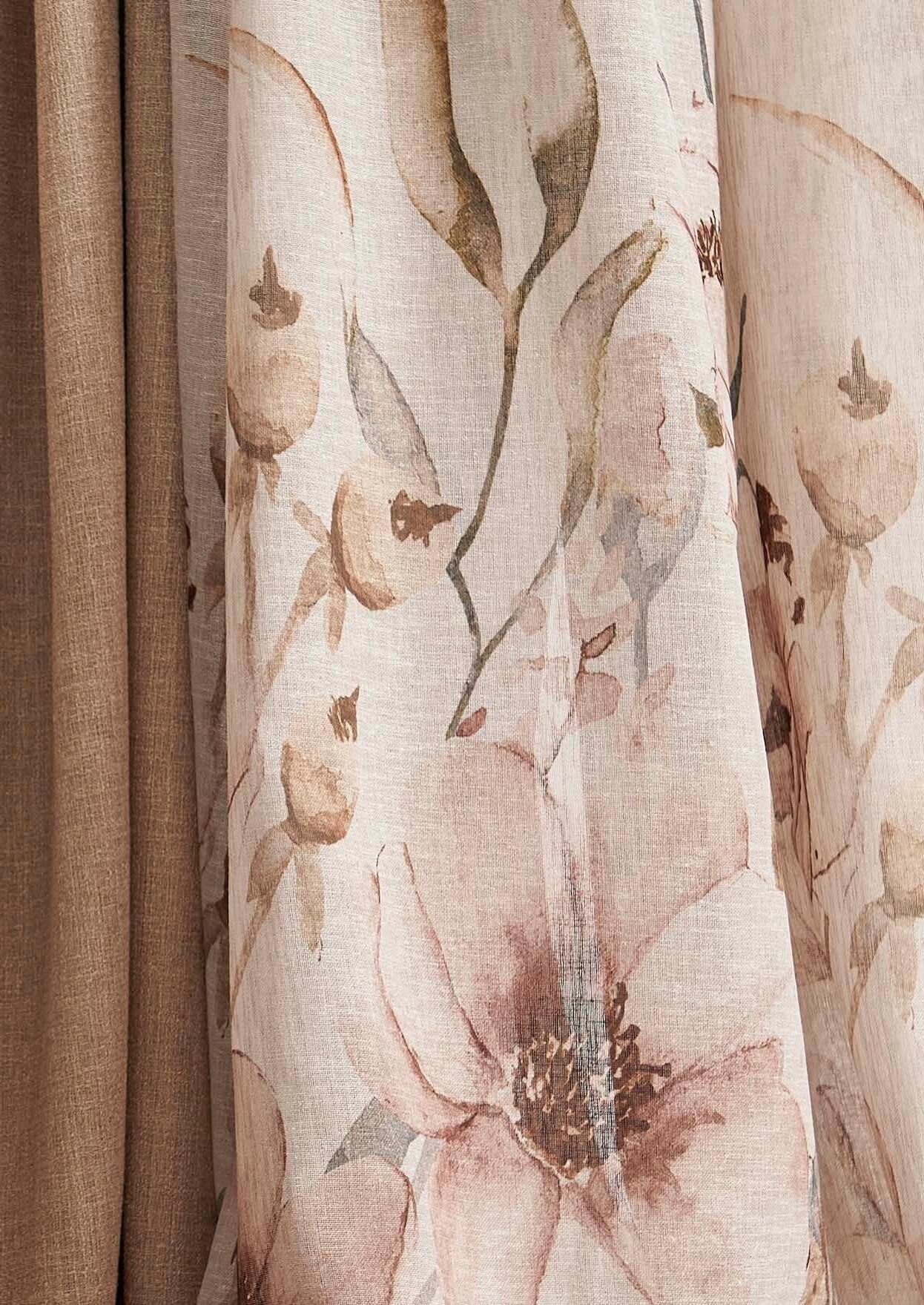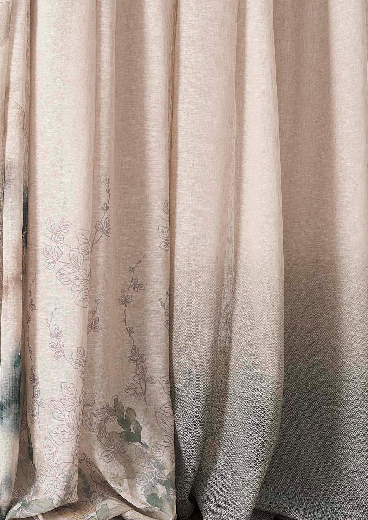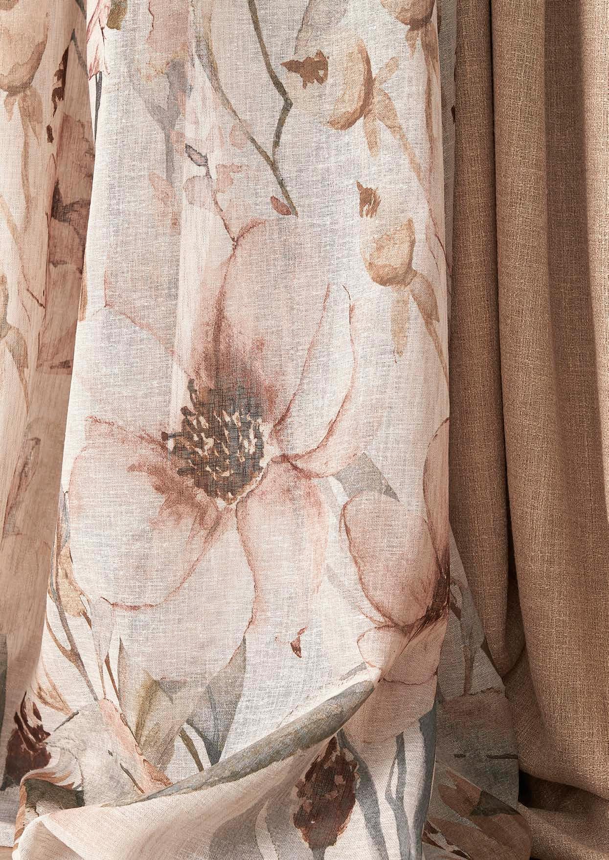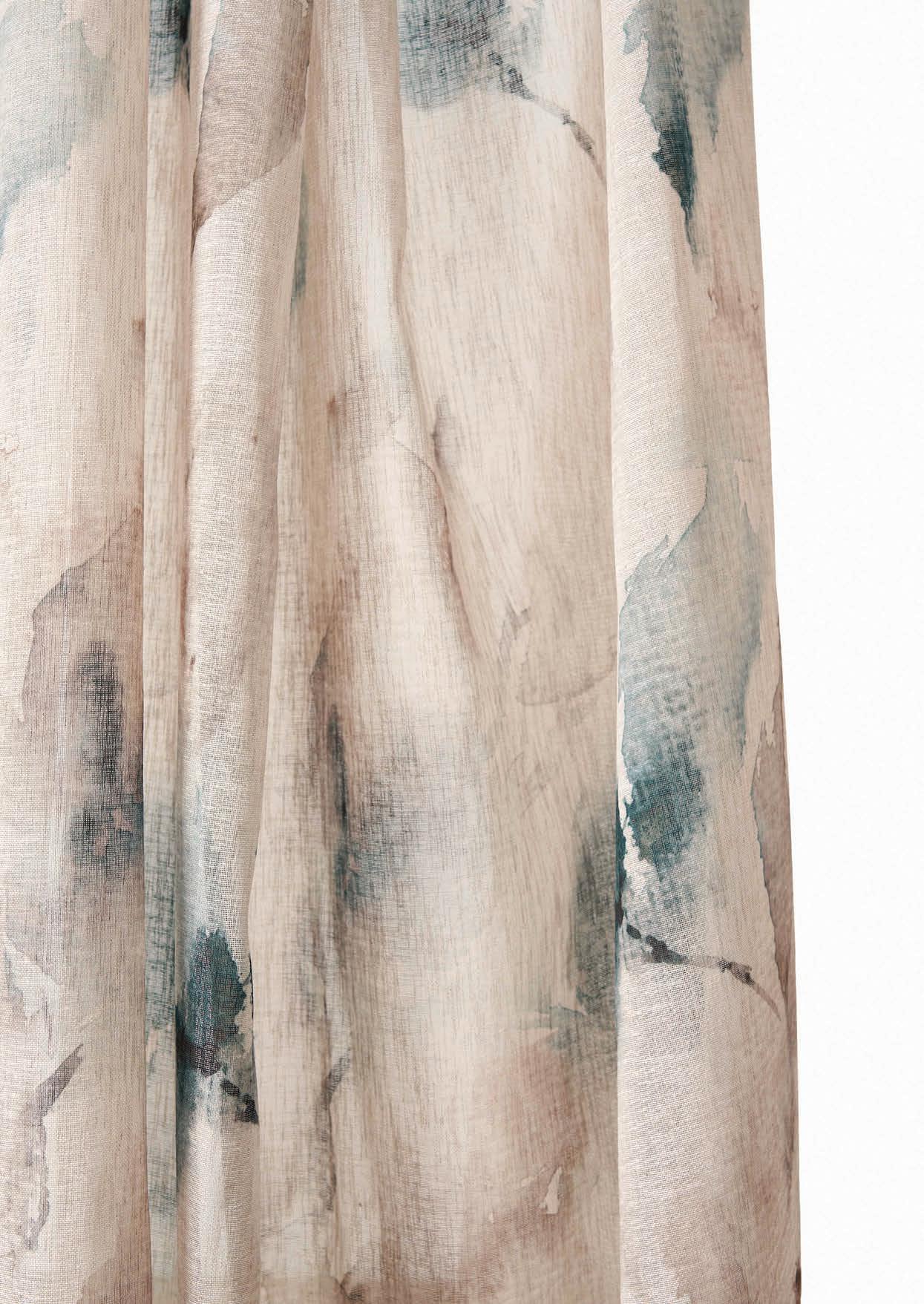 A fresh spring foliage watercolour, delicately printed on a buff base. This wide linen-look sheer is flame retardant and OEKO-TEX® certified. Also available on a white or char base