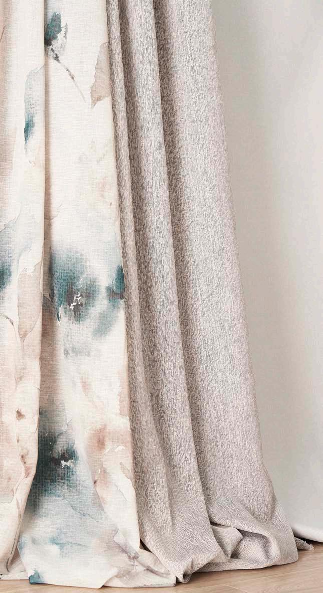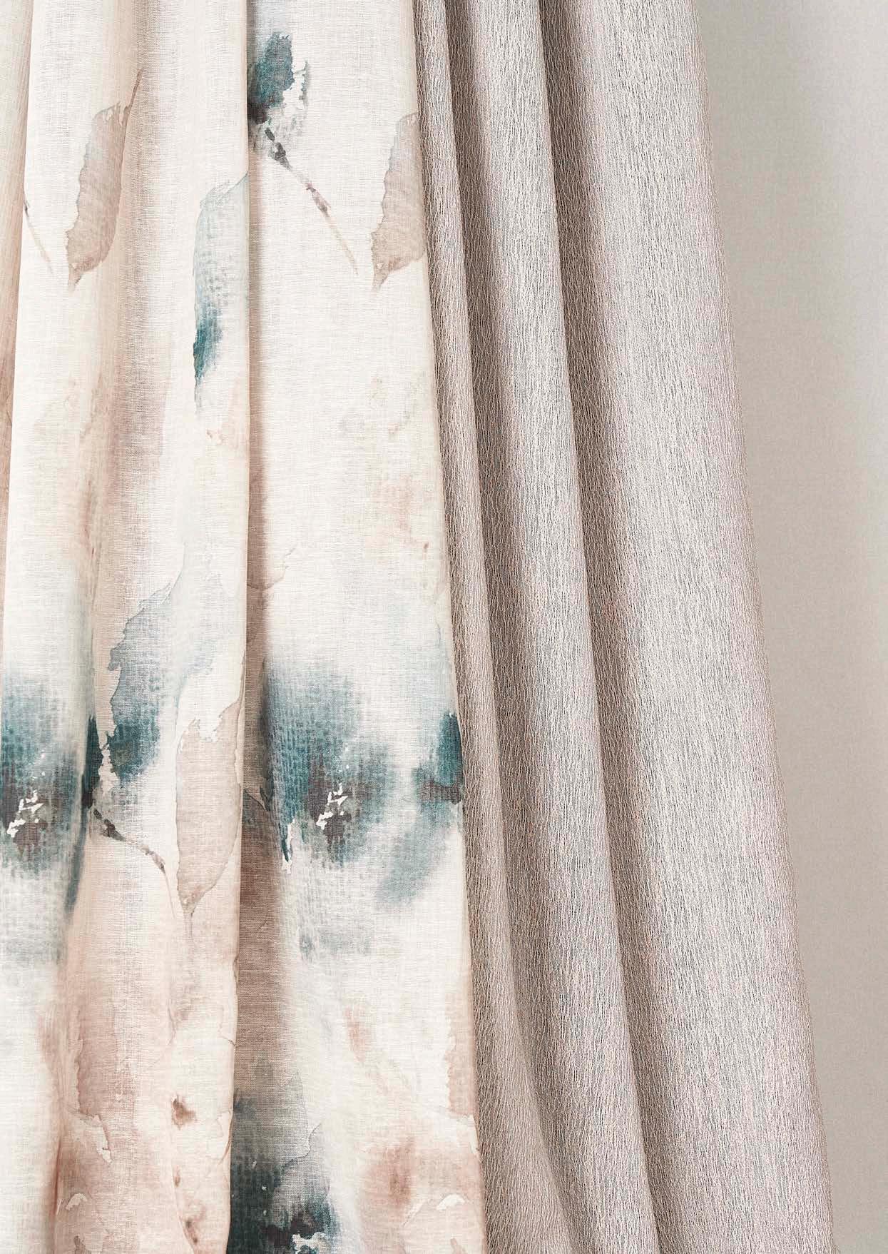 A cool, fresh winter watercolour, delicately printed on a buff base. This 3m wide linen-look sheer is flame retardant and OEKO-TEX® certified. Also available on a white or char base