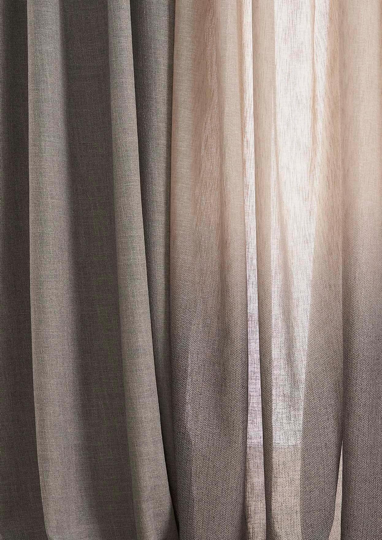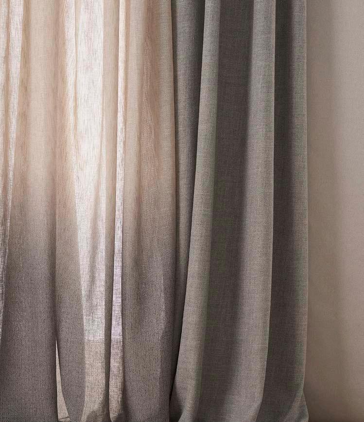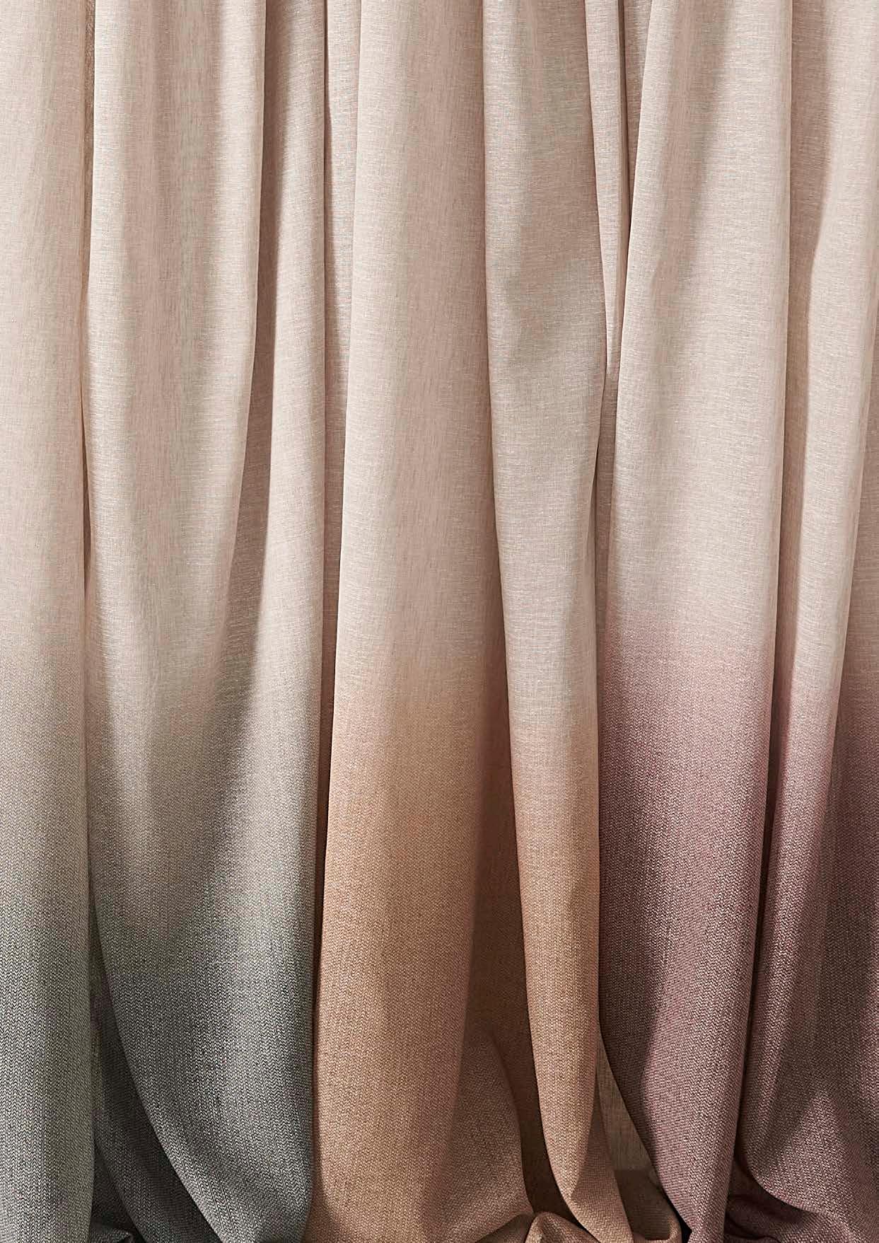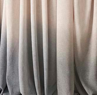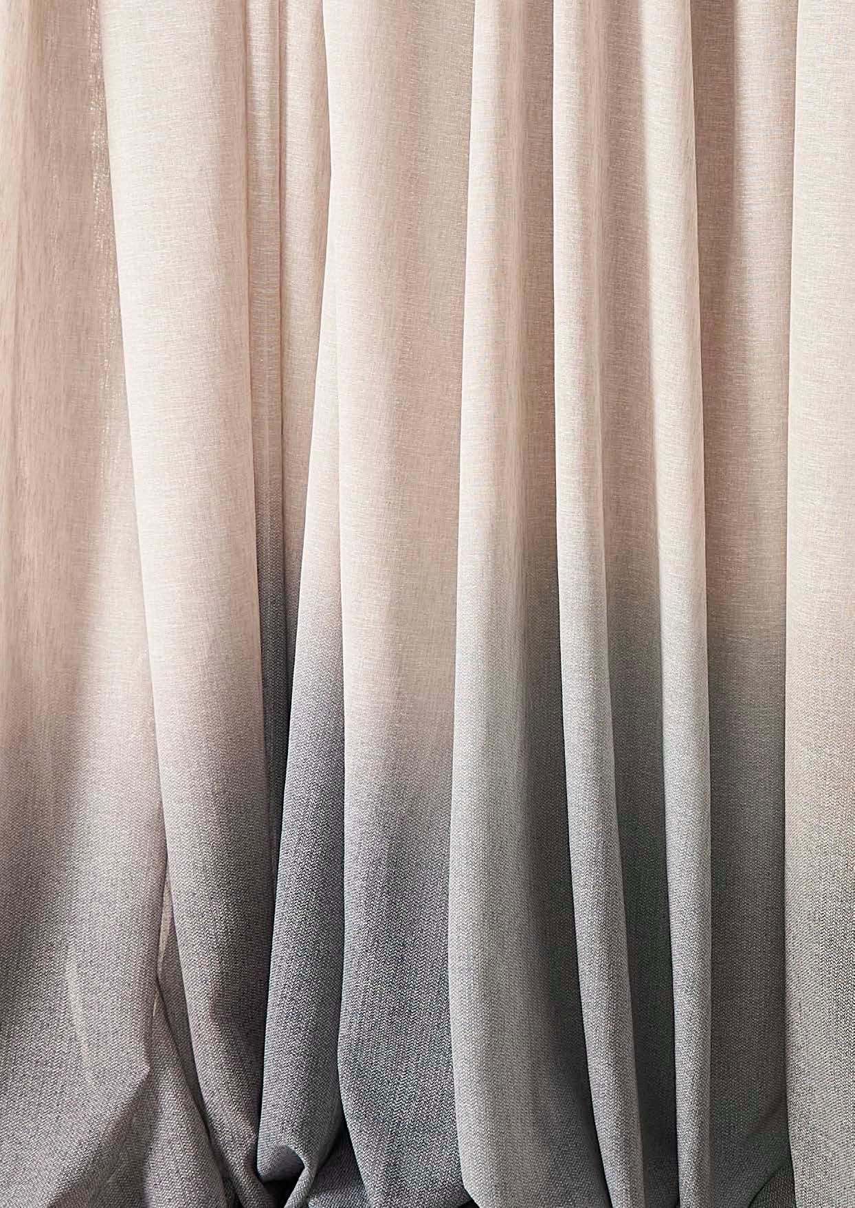 A soft, elegant gradient creating either a full-height or dipped ombré effect. Available in a range of colourways on white, buff, or char bases, these 3m wide linen-look sheers are both flame retardant and OEKO-TEX® certified