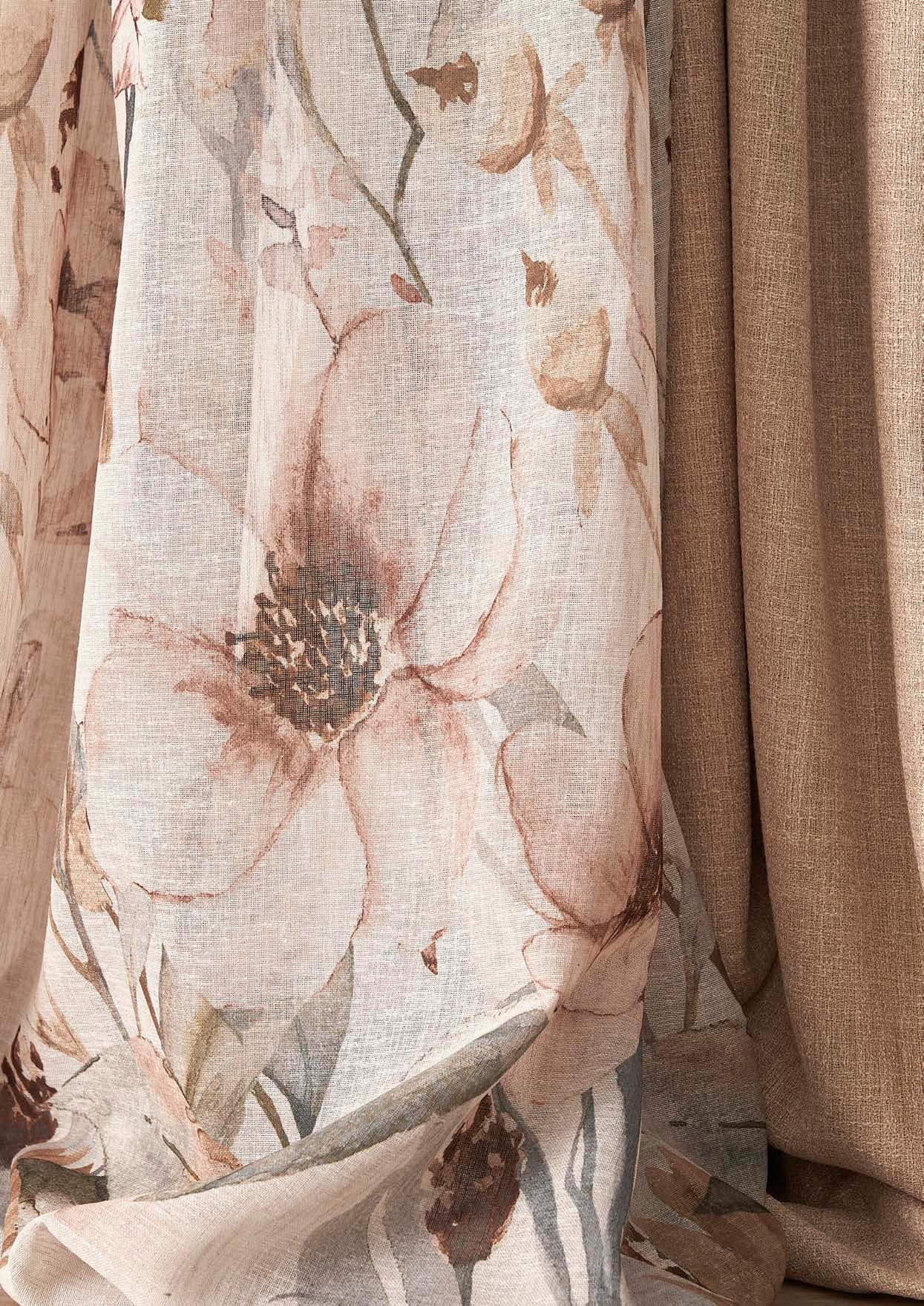A soft, warm autumn watercolour floral border, delicately printed on a buff base. This 3m wide linenlook sheer is flame-retardant and OEKO-TEX® certified. Also available on a white or char base.