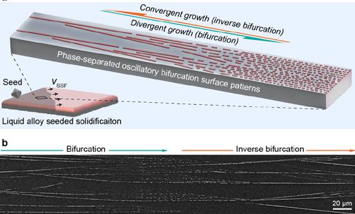 The researchers observed that the patterns divide and unite in a repeated manner. Dr Jianbo Tang from University of New South is the first author of the study who said this came as a surprise. “The first time I saw such cyclic divergent-convergent patterns, it immediately reminded me of the famous opening lines of the Romance of the Three Kingdoms.” Pattern formation is a fundamental yet ubiquitous phenomenon, which has interested and inspired scientists for a long time. In fact, some pattern types are more common than others. Divergent pattern formation, or bifurcation, is frequently seen in nature because the arrangement tends to favour energy conversion or distribution. Bifurcation is evident in river networks, tree branches, lightning pathways, and vascular systems. In comparison, convergent pattern growth, or inverse bifurcation, is encountered less frequently. The cyclic divergent and convergent growth is rare and has not been observed in solidification structures before this piece of work. The researchers observed oscillatory bifurcation patterns on the surface of several liquid alloys after solidification. This suggests this counter-intuitive behaviour is quite general for solidification patterns forming on the surface of liquid metals.