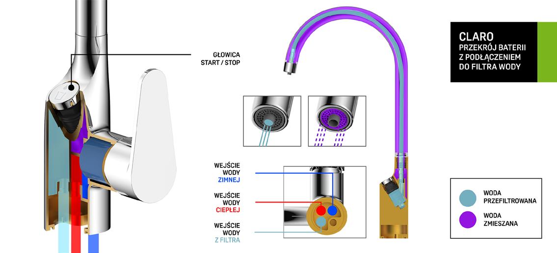 Claro to seria baterii kuchennych z podłączeniem do filtra wody. Dzięki przyciskowi, który znajduje się w korpusie baterii, możemy pić przefiltrowaną wodę prosto z kranu. W zestawie baterii Claro znajdziemy dodatkowy, trzeci wężyk, który podłączamy do filtra, montowanego pod zlewem. Instalacja jest łatwa i szybka, a sam filtr podlega recyklingowi. Oferowana dostępność na rynku filtrów umożliwia odpowiednie dopasowanie do własnych potrzeb i jakości wody, którą mamy w instalacji domowej. Filtrowaną wodą, możemy cieszyć się z reguły przez okres 6 miesięcy, zanim filtr będzie wymagał wymiany. Taki okres pozwoli zaoszczędzić na zakupie wody butelkowanej oraz przyczyni się do redukcji plastiku.