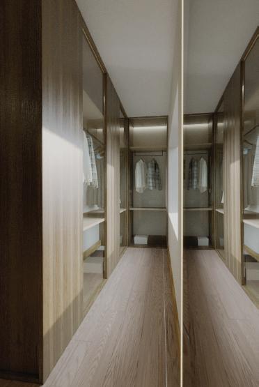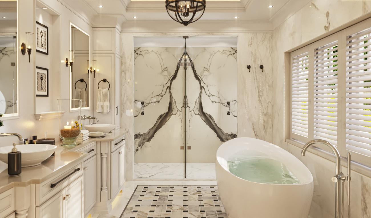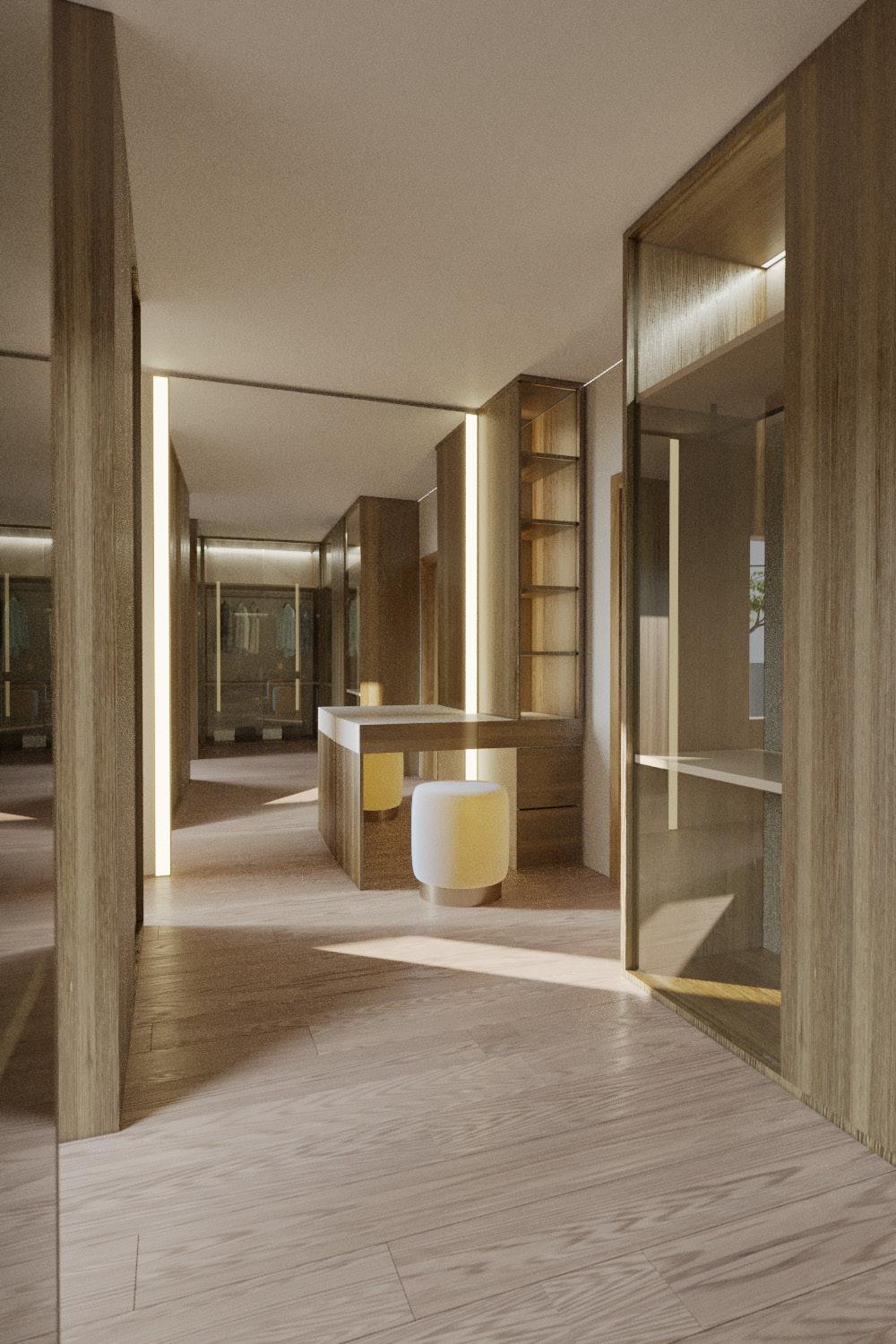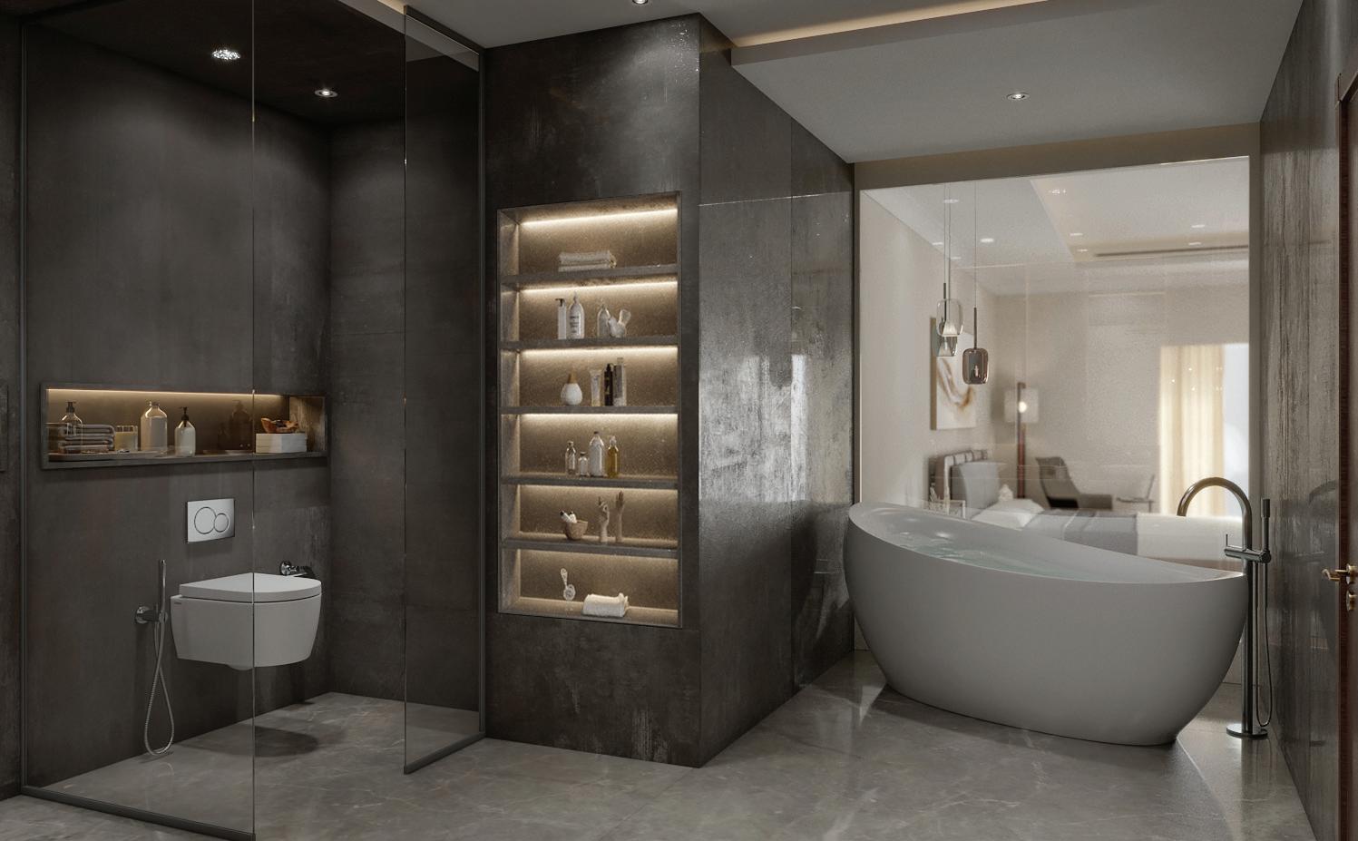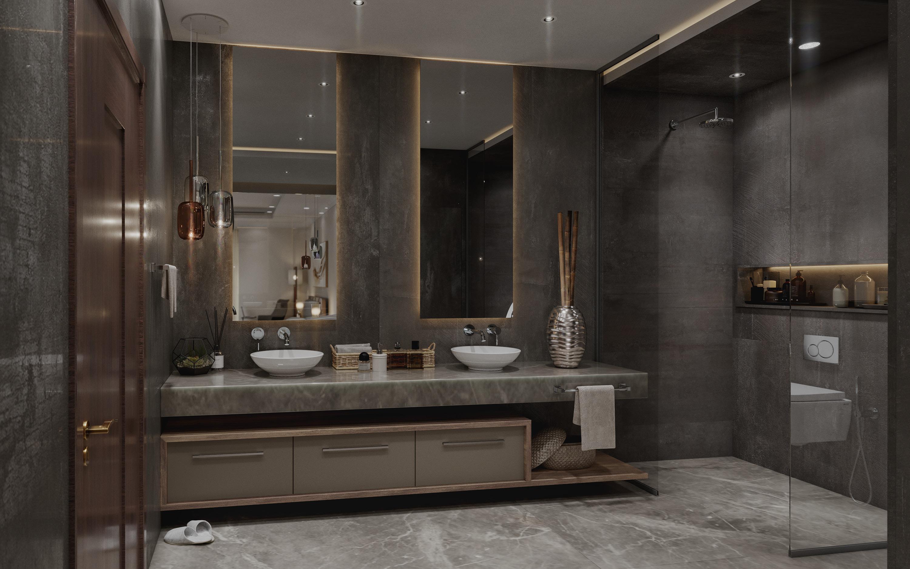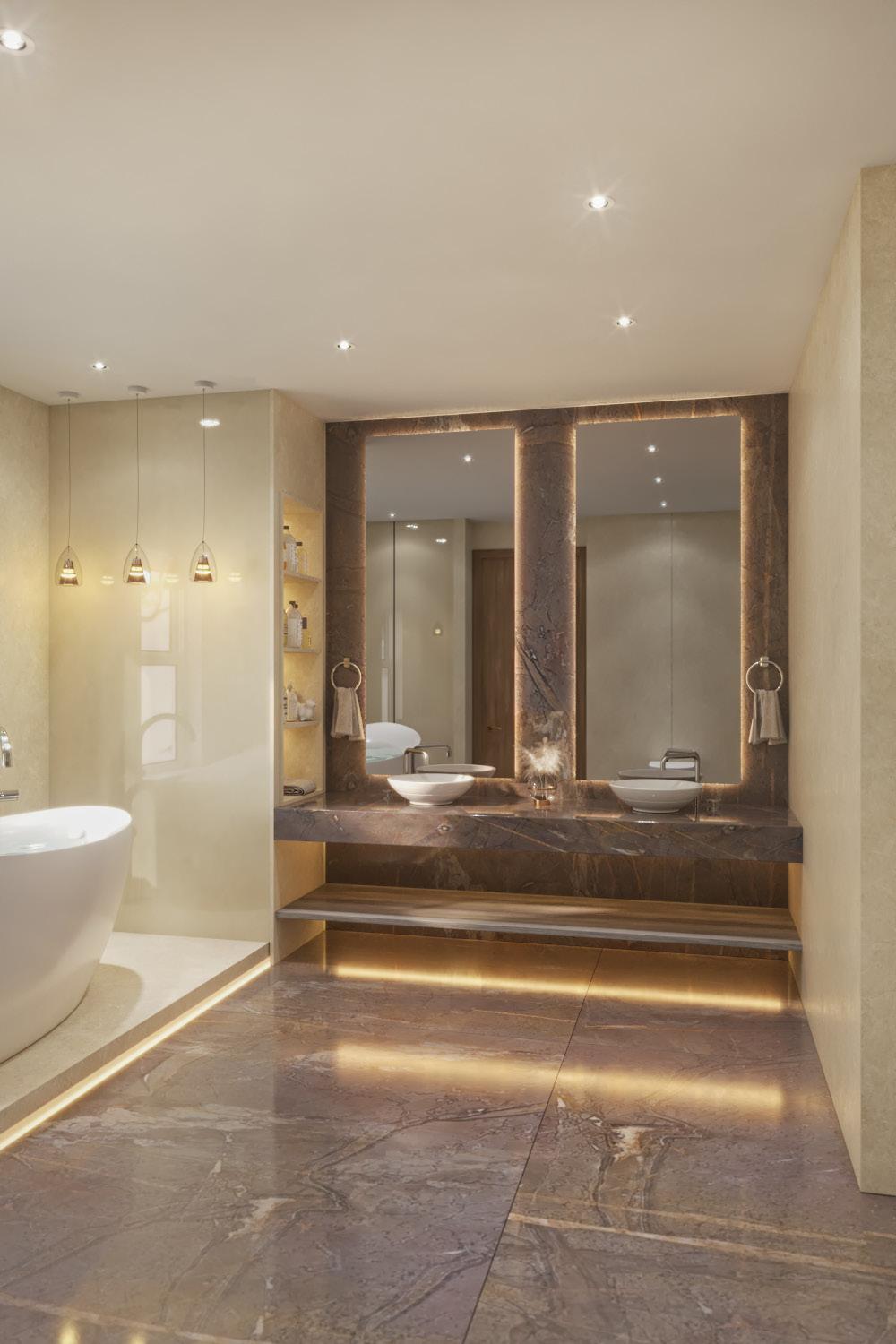 Bathtub to be placed on step-up, creating the need to bring the basins over the right and increasing the shaft area. To utilise this lost space and add some detail, we have added recessed shelving in the left side.