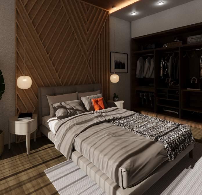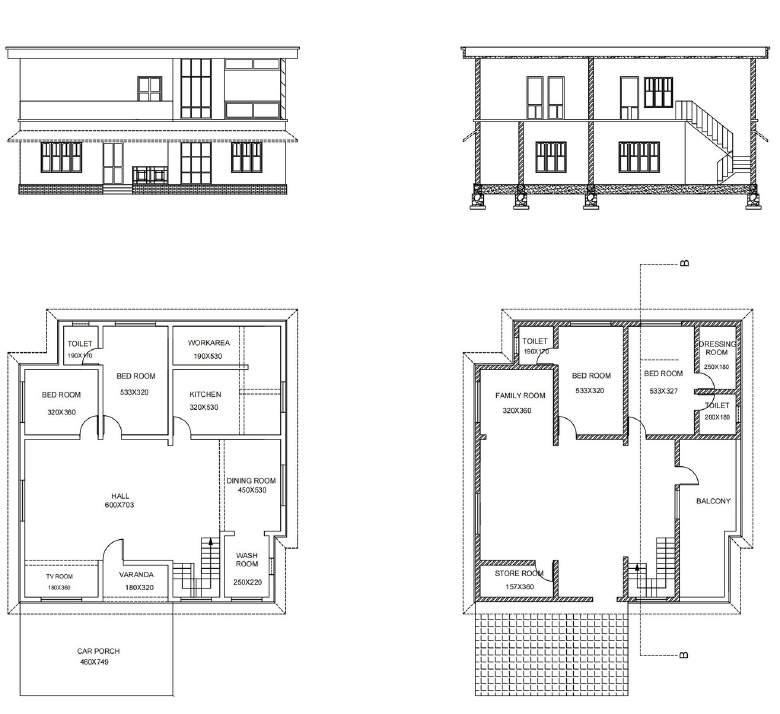 This small residential house of about 2500 square feet has four bedrooms, two on the ground floor and two on the upper level, with two attached bedrooms, one on each floor.
