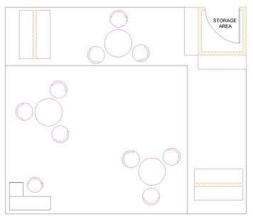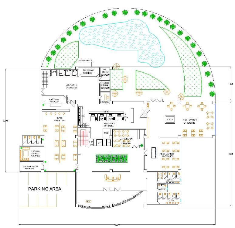 This hotel ground plan features a restaurant with live music and outdoor seating, as well as a nearby swimming pool. Enjoy the sun while ordering food and drinks. A bar near the restaurant and kitchen provides guests with additional dining options.